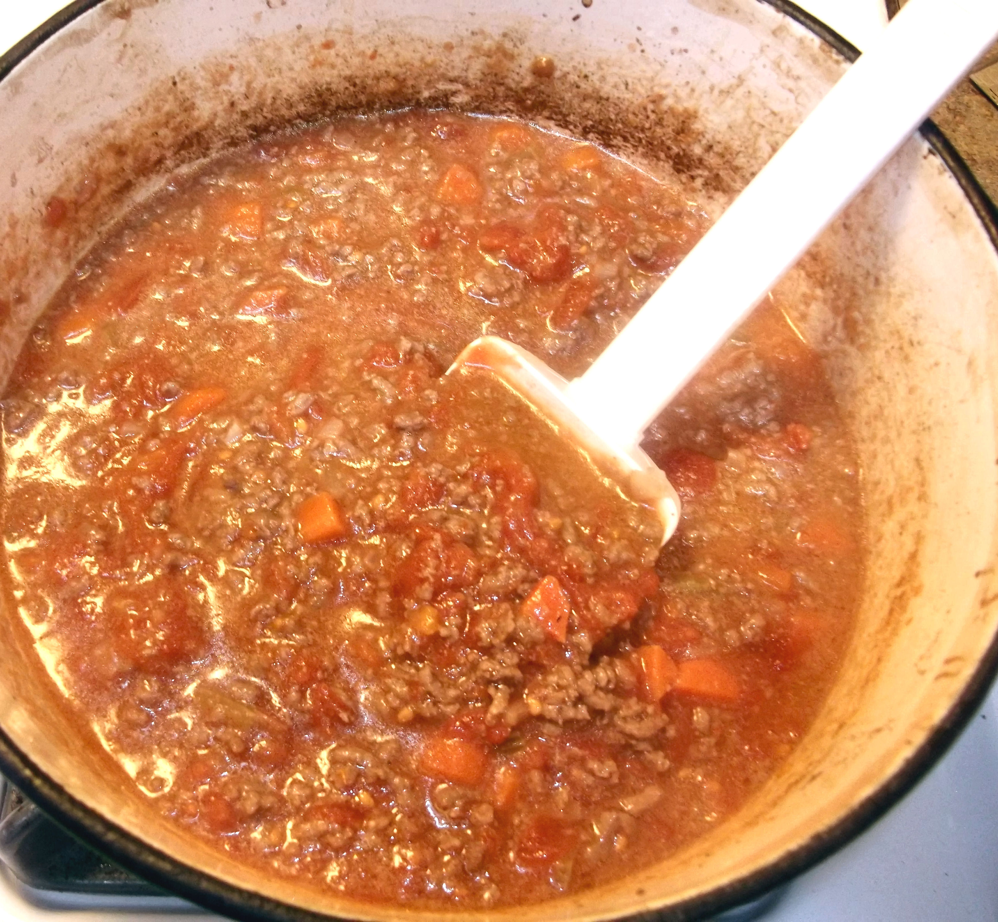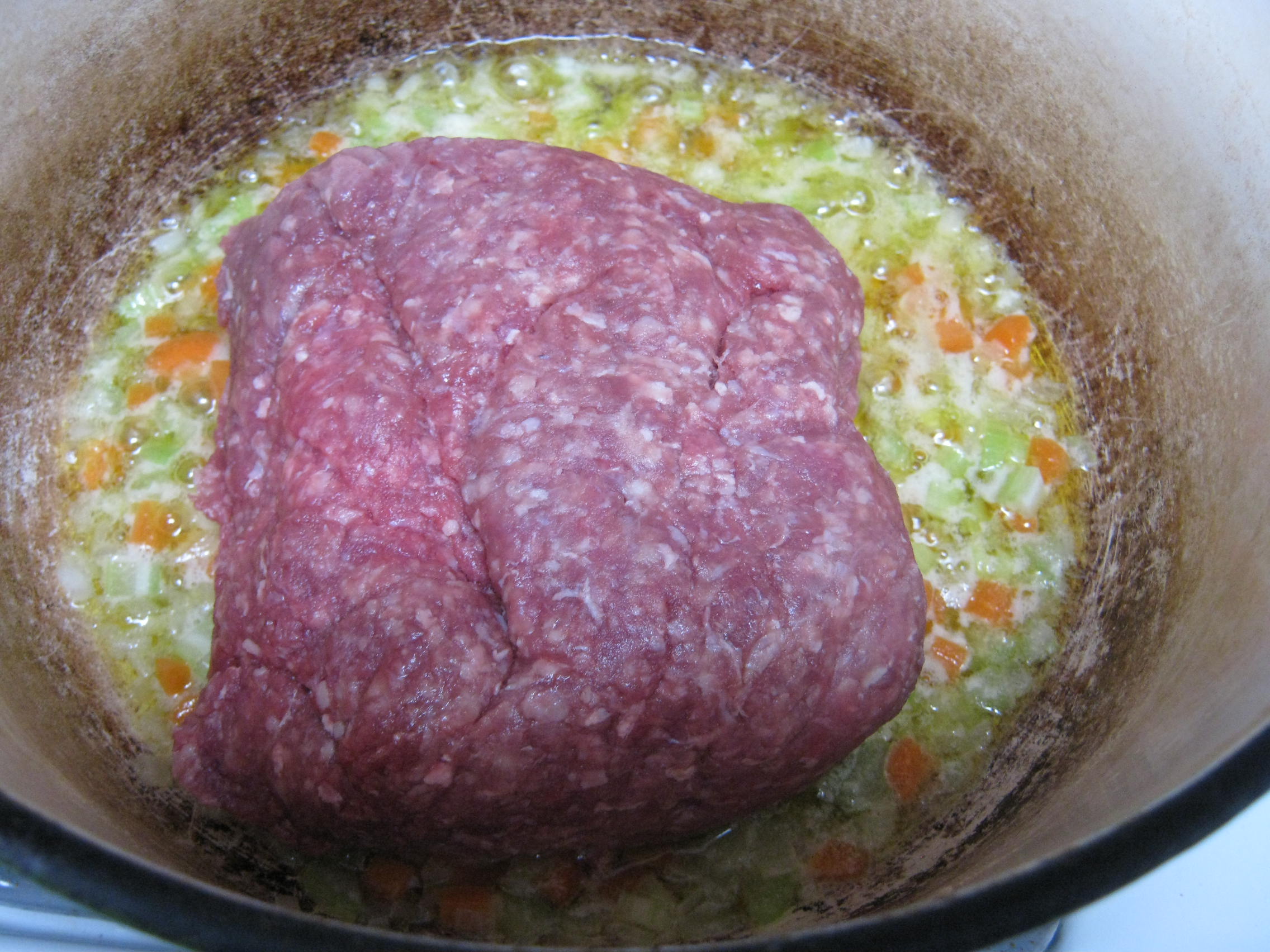 In a Dutch oven or large heavy pot, add the onion with the oil and butter and sauté briefly over medium heat until translucent. Add the celery and carrot and cook for 2 minutes. Add the ground beef, crumbling it in the pot with a fork. Add 1 teaspoon salt, stir, and cook only until the meat has lost its red, raw color. Add the wine, turn the heat up to medium high, and cook, stirring occasionally, until all the wine has evaporated, 10 minutes or so.
