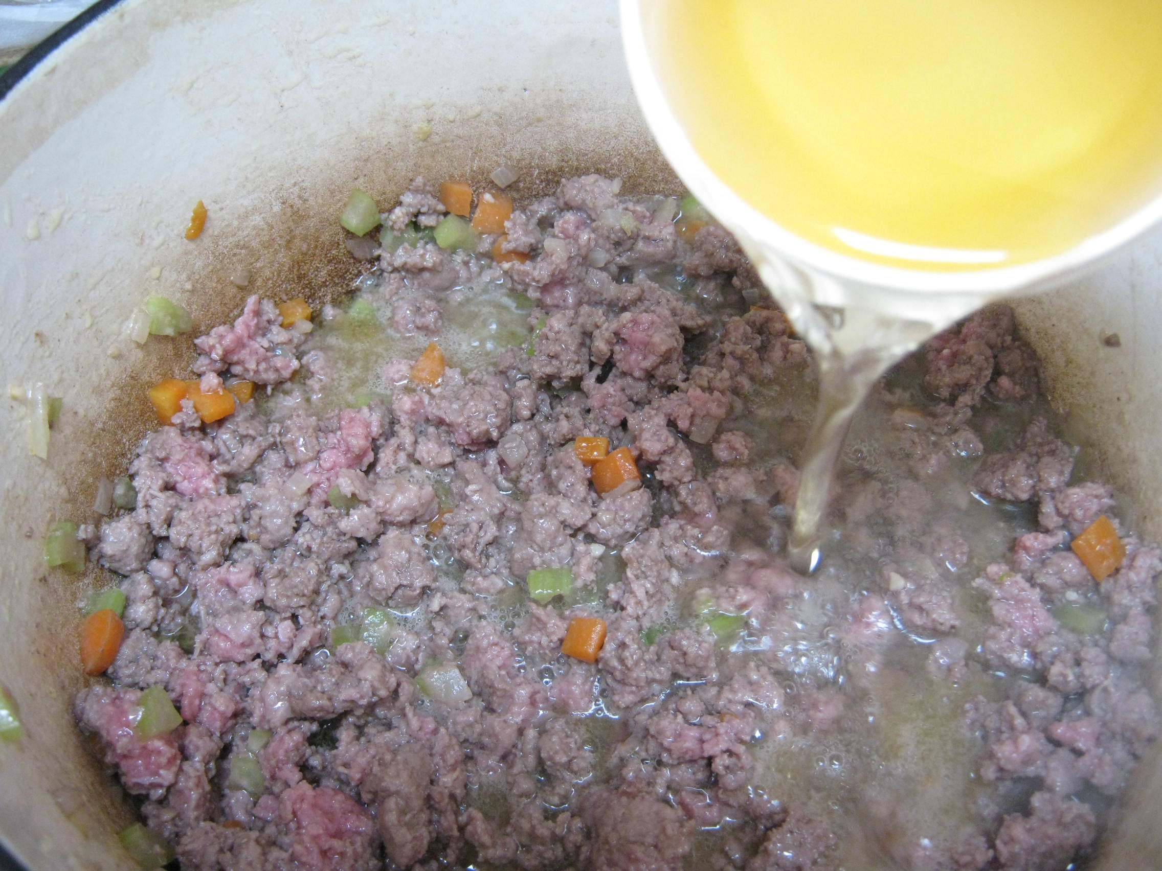 Add the celery and carrot, cook for 2 minutes, then add the ground beef.