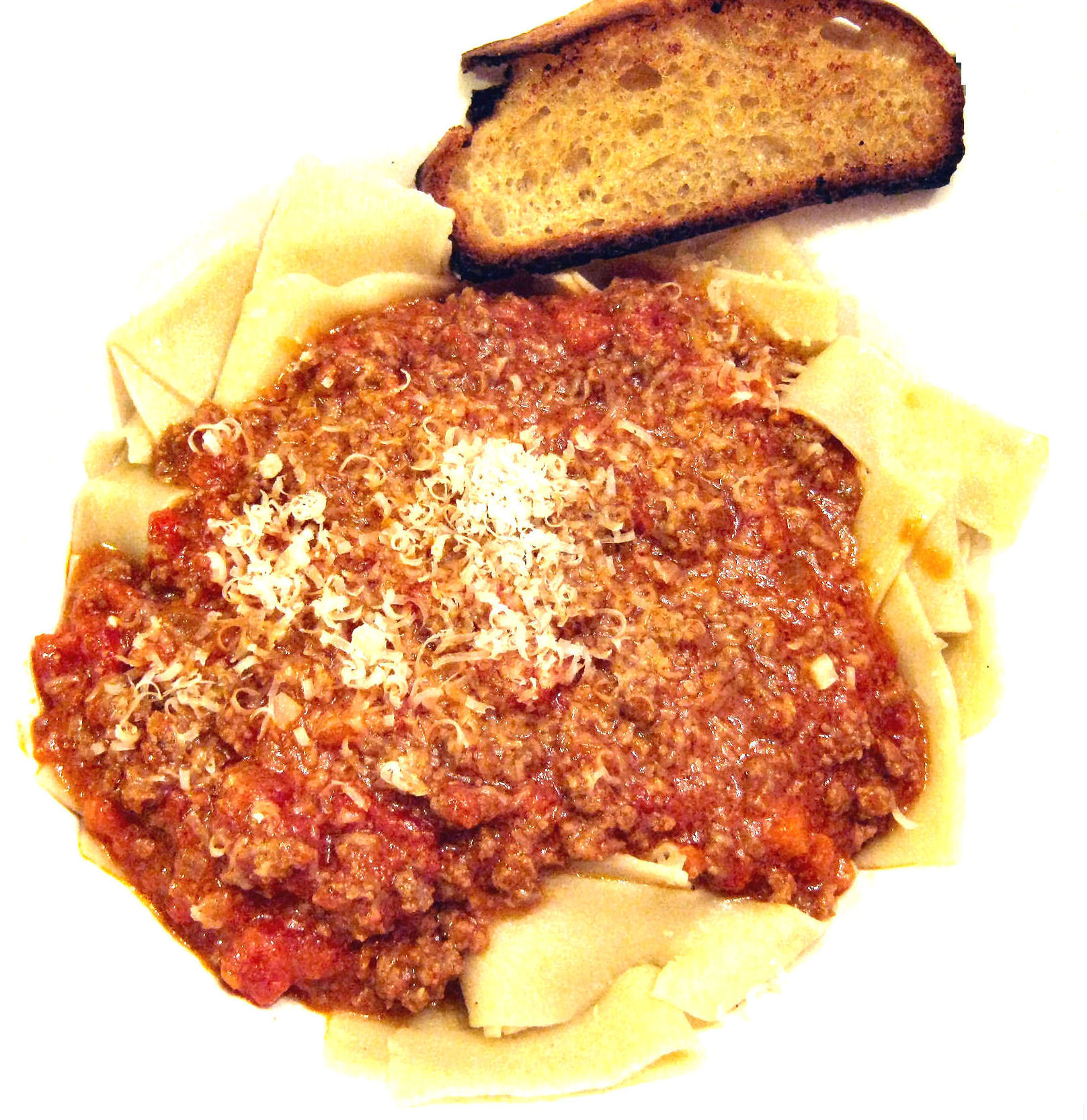 Turn the heat down to medium, add the milk and the nutmeg, and cook until the milk has evaporated. Stir frequently. When the milk has evaporated, add the tomatoes and stir thoroughly. When the tomatoes have started to bubble, turn the heat down until the sauce cooks at the laziest simmer, just an occasional bubble. Add tomato paste and/or vinegar to taste. Cook, uncovered, for a minimum of 3½ to 4 hours, stirring occasionally. Serve over spaghetti or fresh tagliatelle.