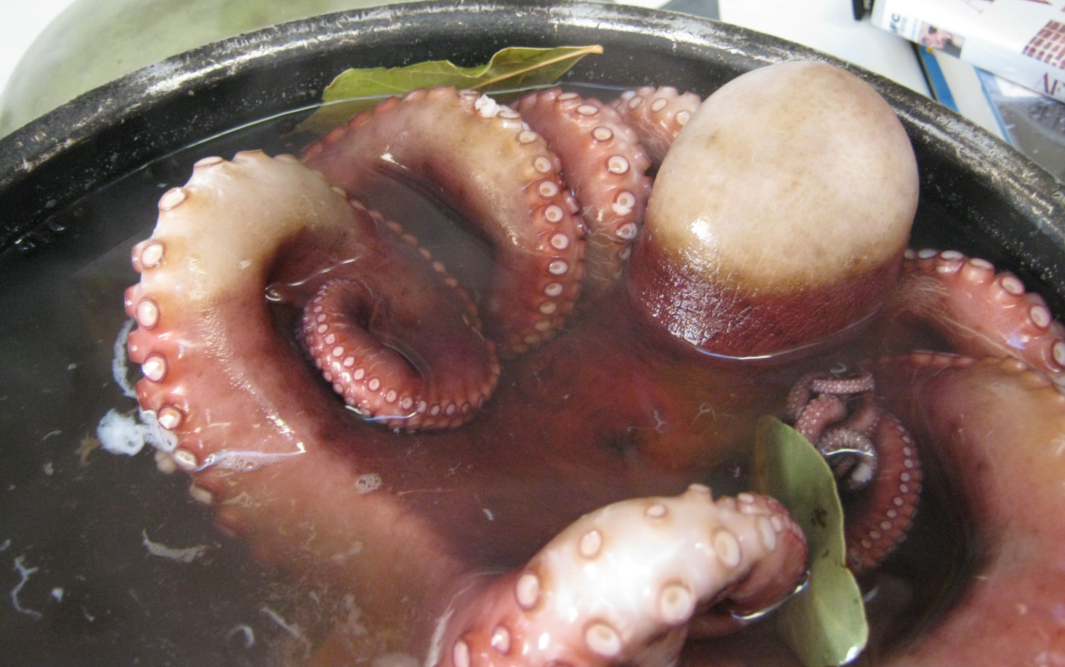 The Spanish cook these in big copper cauldrons, where the copper adds a red color to the octopus. Assuming you don’t have a copper cauldron, you can get the same effect by using a penny. Really. Just one penny is all you need. You can see in this photo that the submerged parts have a red tinge, while the parts that didn’t come in contact with the water (or, therefore, the penny) are still white.