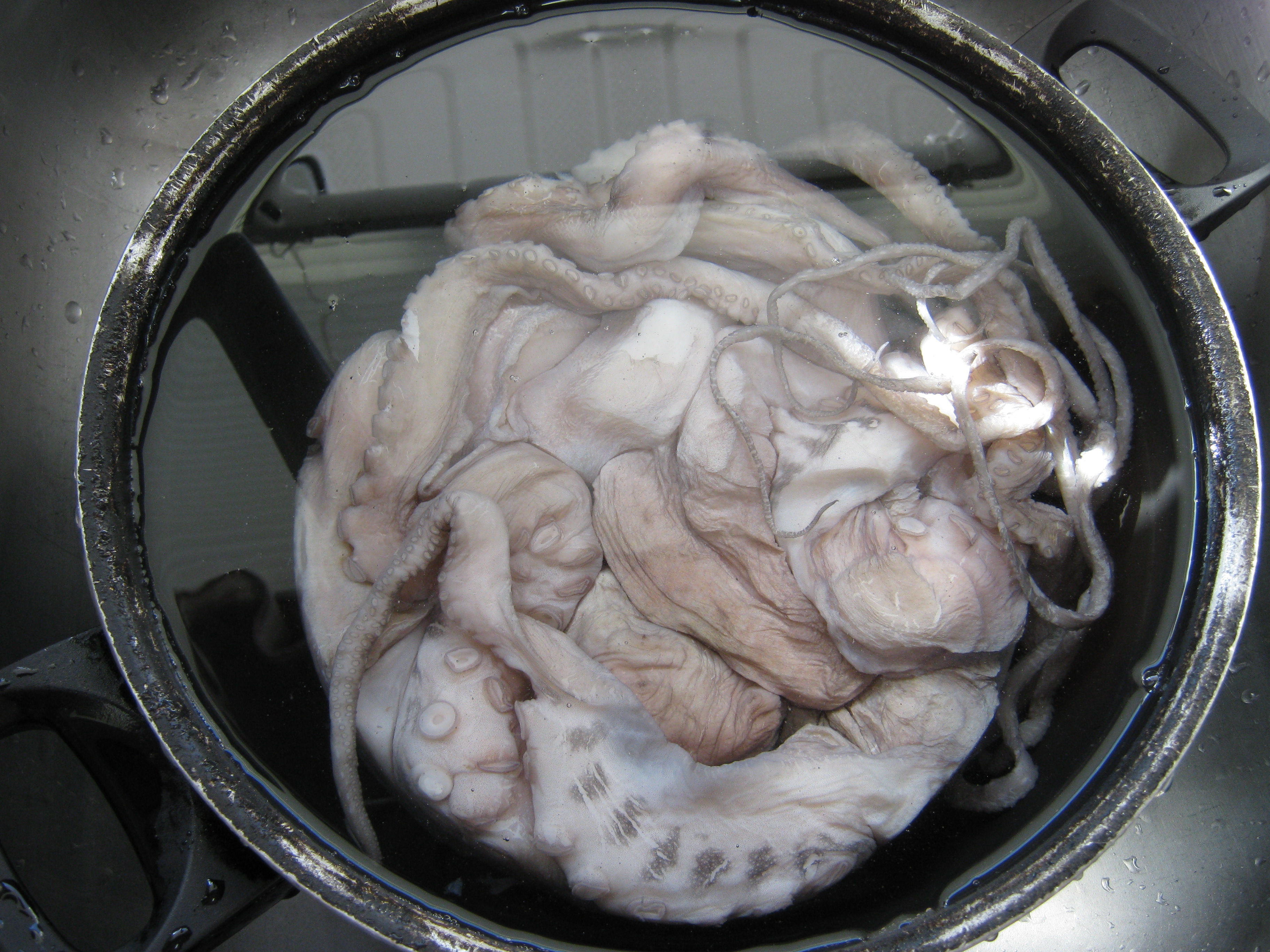 Unless you just happened to catch a fresh octopus somewhere, it will probably come frozen, so the first thing to do is thaw it in water for several hours.
