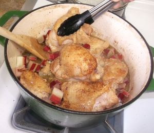 This recipe solves that problem. When you no longer have room in the freezer for the cakes, pies, and tarts, and no more room in the pantry for the jams, jellies, and chutneys, use up that rhubarb in a delicious chicken dinner!