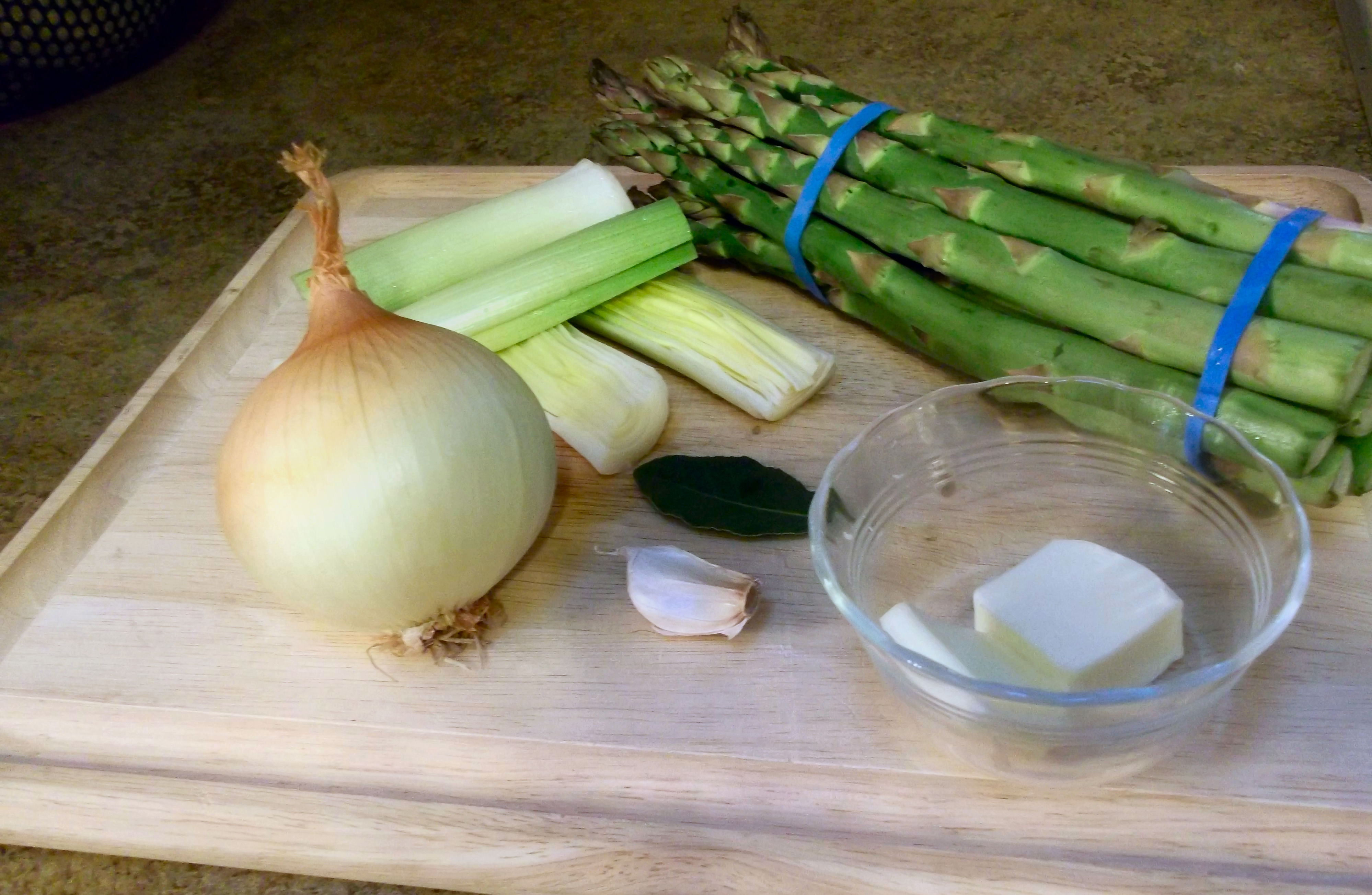 In a large saucepan, melt one tablespoon butter and sauté onion, leeks, and garlic until soft and translucent (about 5 minutes). Add bay leaf, white wine and asparagus. Simmer over medium heat until wine is reduced by half. Add stock and simmer for 10-20 minutes, about half covered. Add the cream and remove the bay leaf. Using a hand mixer or blender, puree the ingredients until smooth.