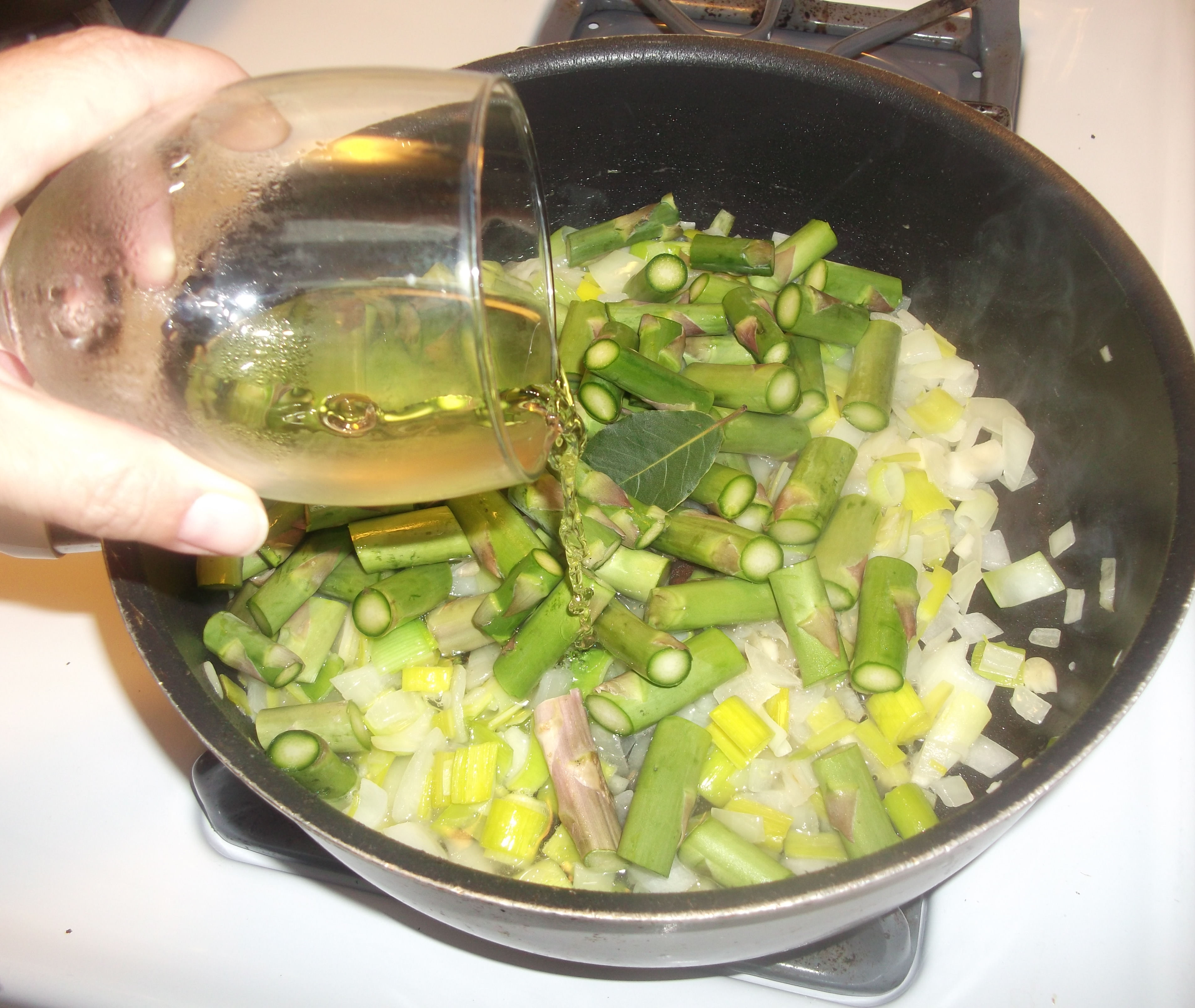 Add the bay leaf and chopped asparagus to the pan, then add the white wine. You can refill this glass with the same wine and enjoy it with the finished soup. Or even while you are still making the soup, if that’s how you roll.