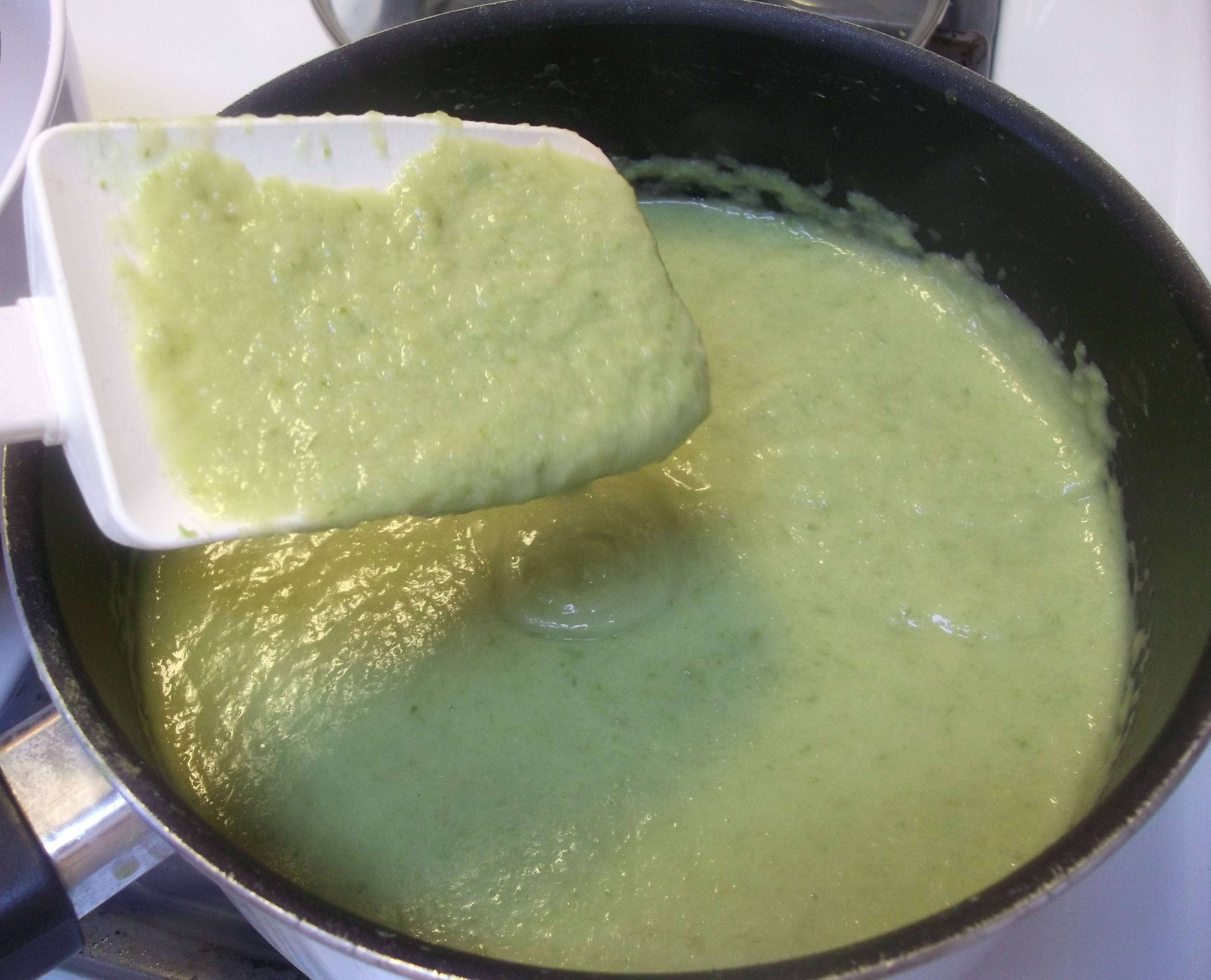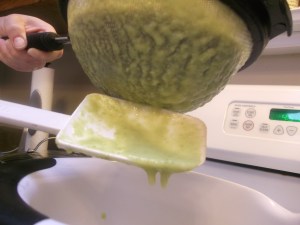 Using an immersion mixer (or pour it into a blender), puree the ingredients until smooth. Transfer the soup to a deeper pan, if needed for this step, in order to keep the immersion mixer tip submerged in the liquid. I’ve learned from experience that if the liquid is too shallow, it just splatters it all over me, my stove, and my walls. Not fun. Plus it’s a waste of perfectly good soup.