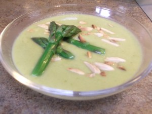 Season the soup with salt and pepper to taste. To serve, ladle into warm bowls and garnish with asparagus tips and slivered almonds. Top with some fresh chopped tarragon (not shown here), if available, and it will take it to a whole new level.