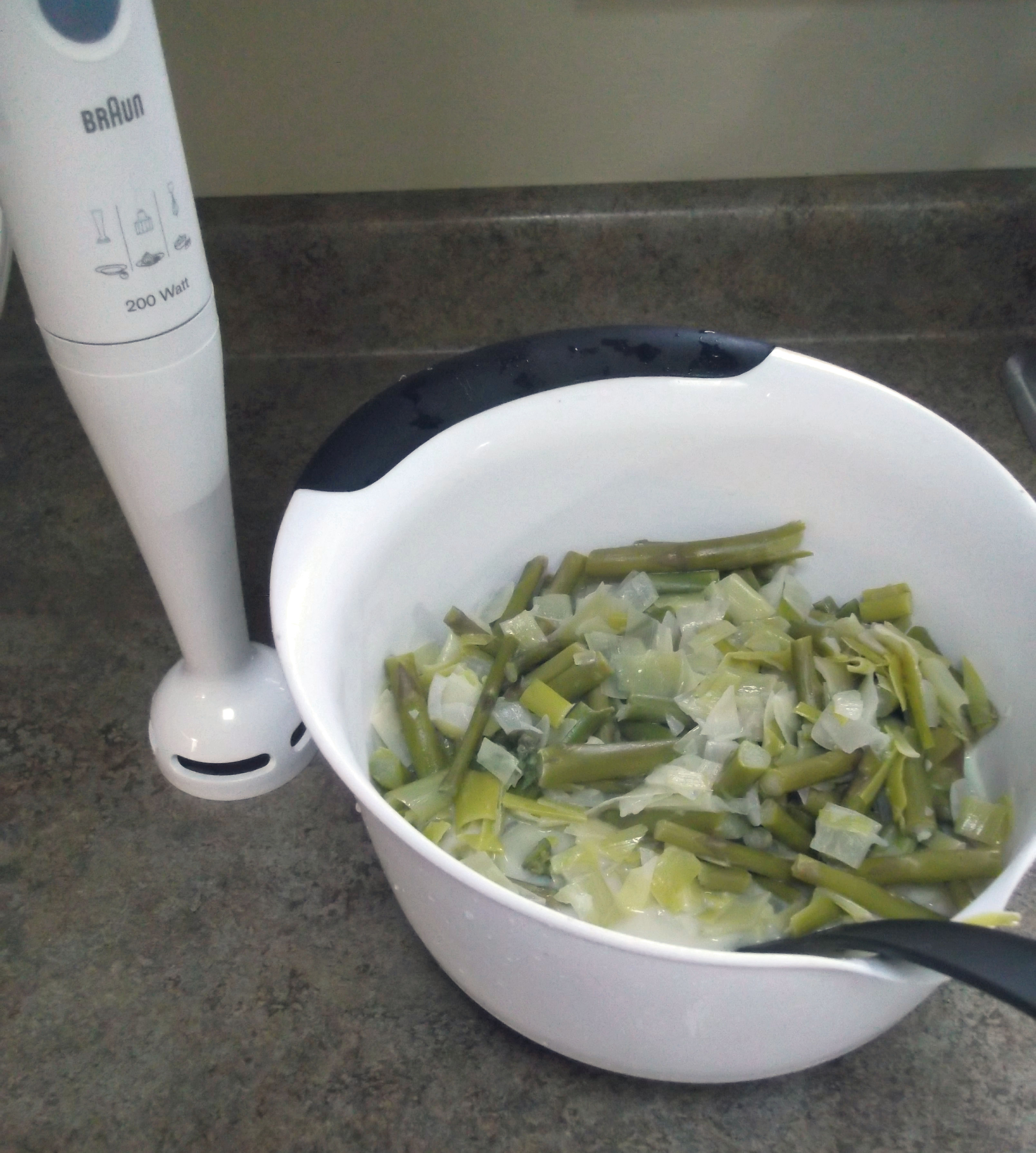 If using a strainer, don’t use too fine a strainer, or it won’t work: it needs to be coarse, with the biggest holes. This step is messy and somewhat time consuming, but it really is worth it. Otherwise you’ve just got asparagus puree, which isn’t nearly as nice to eat as the finished soup will be.