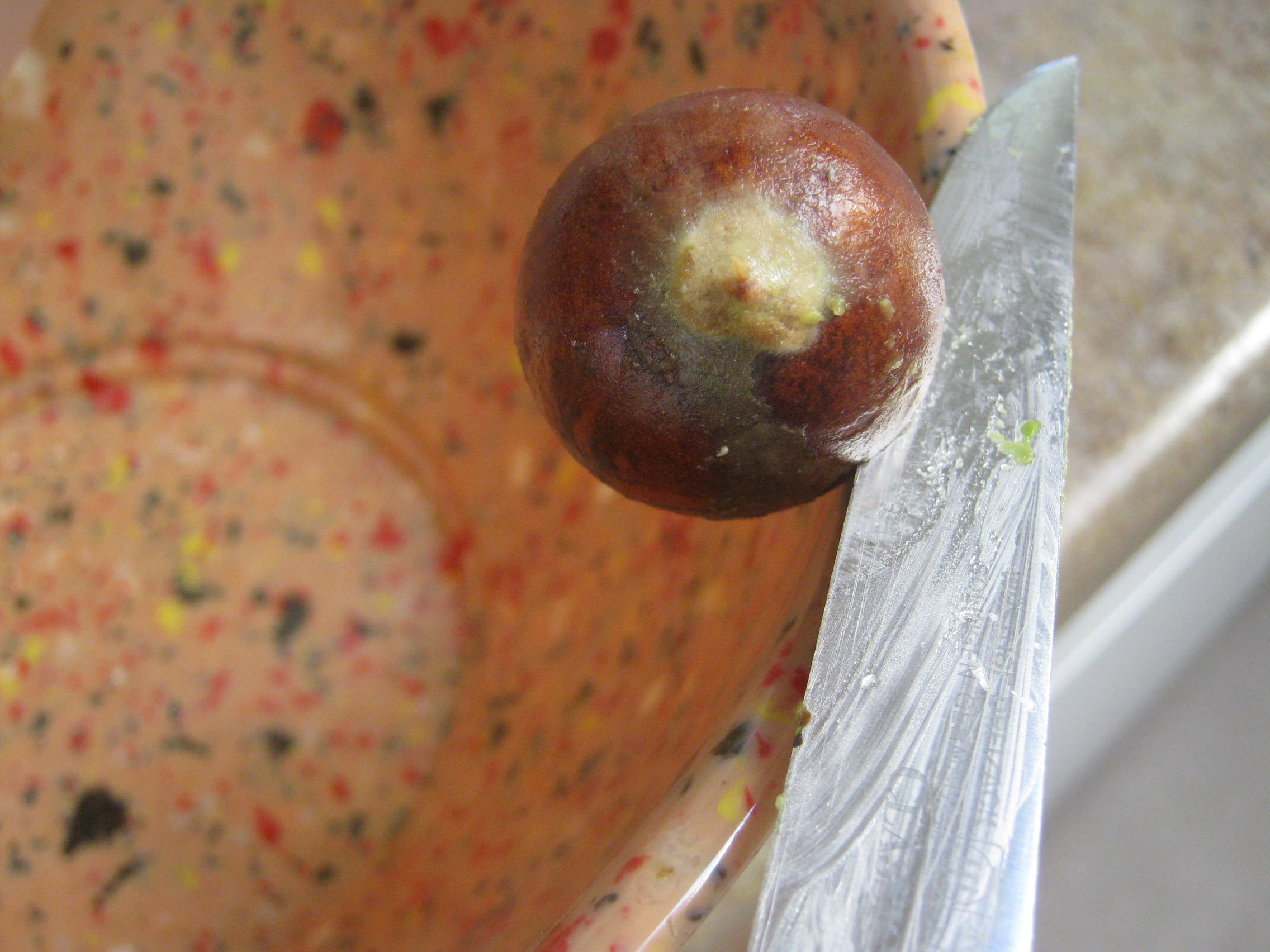 Scrape/nudge the pit against the edge of a waste bowl (or your trash container) to get it to fall off the knife. Don’t try to pull the pit off the knife, as it’s round and slippery and hard to get a good grip on it.