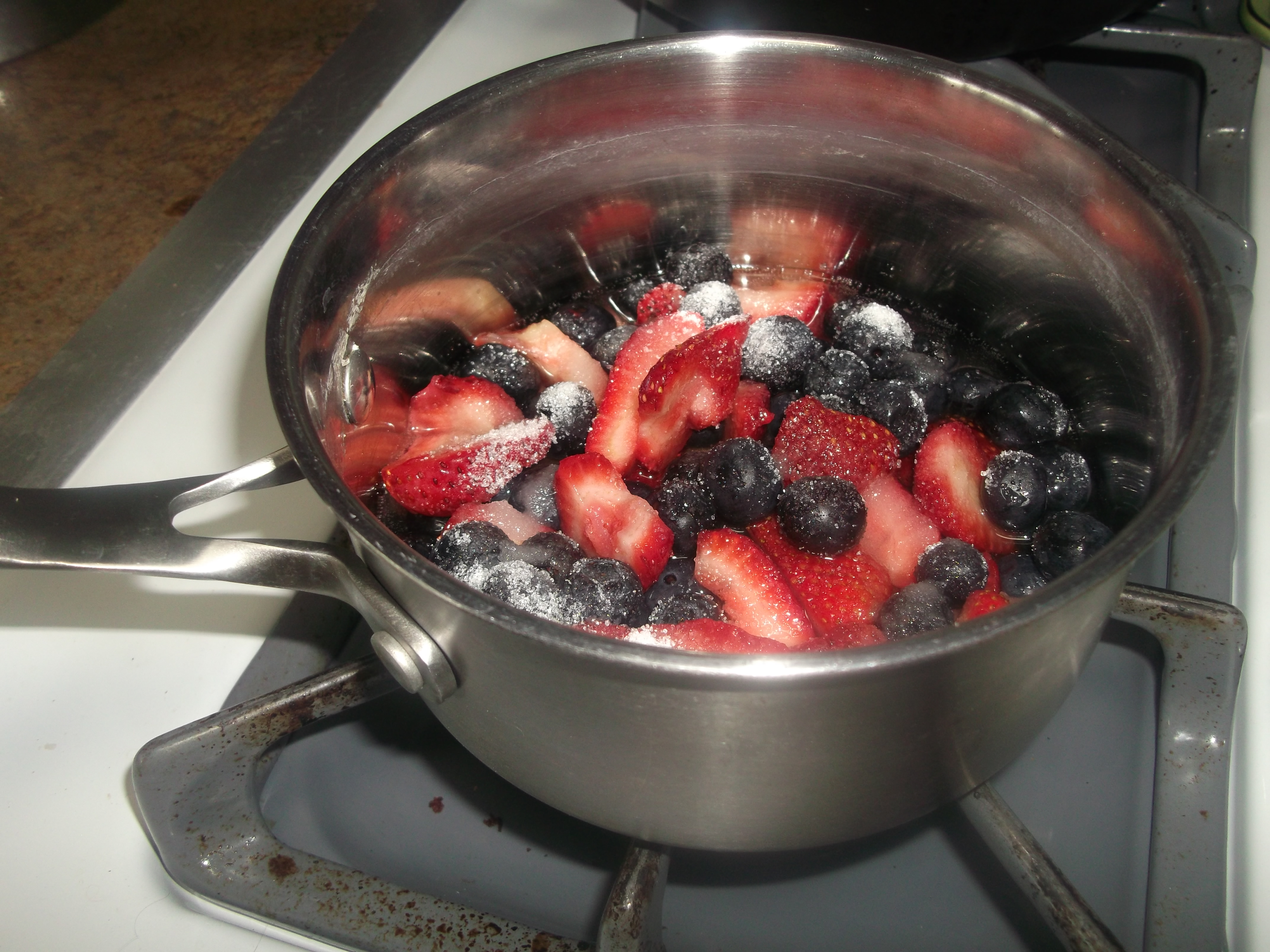 Place half of the berries, along with the sugar and lemon juice, in a medium saucepan. Since this mixture cooks down, used any softer bits of fruit in here: the riper berries, or the pieces that are a little soft and mushy. (Note: if you are in a time crunch, you can skip this step and just use whole berries for the dessert. This just kind of melds them all together a little nicer.)
