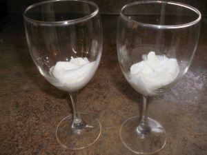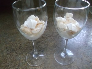 1) Spoon a little whipped cream into the bottom of the dish/goblet. (A note on the whipped cream: not only is it extra time and work to make your own, but whipping real cream makes this otherwise healthful dessert packed with fat, so I choose to use Cool Whip. Feel free to make your own whipped cream or use whatever fat-content variety of a prepackaged whipped cream product you prefer.)