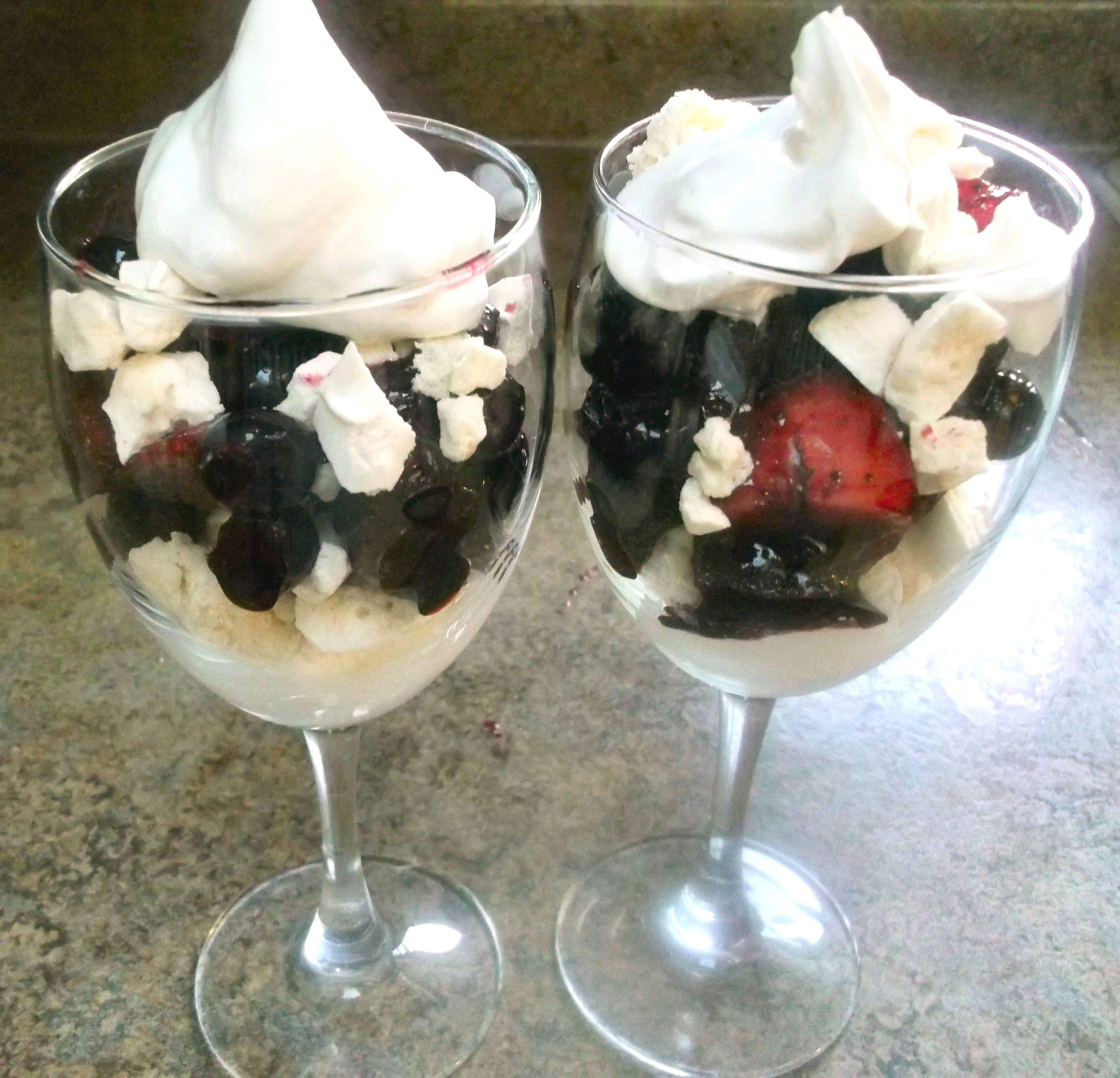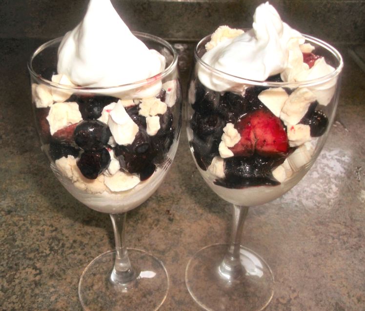To serve, assemble the desserts as follows: spoon a little whipped cream into the bottom of the dish/goblet, top with some of the crushed meringue cookies, and then add the berries. Repeat, and top with whipped cream just before serving. (Can cover and refrigerate for several hours.)