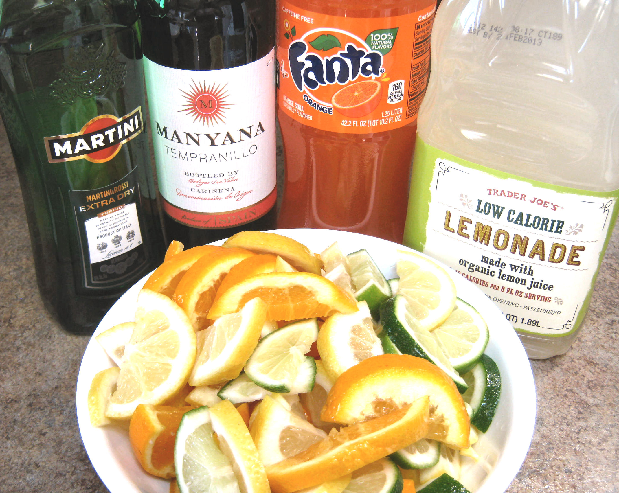 This one is pretty easy. Get your ingredients ready. For the red wine, I prefer a Spanish Tempranillo. Manyana is a great brand in the $5-7 range.