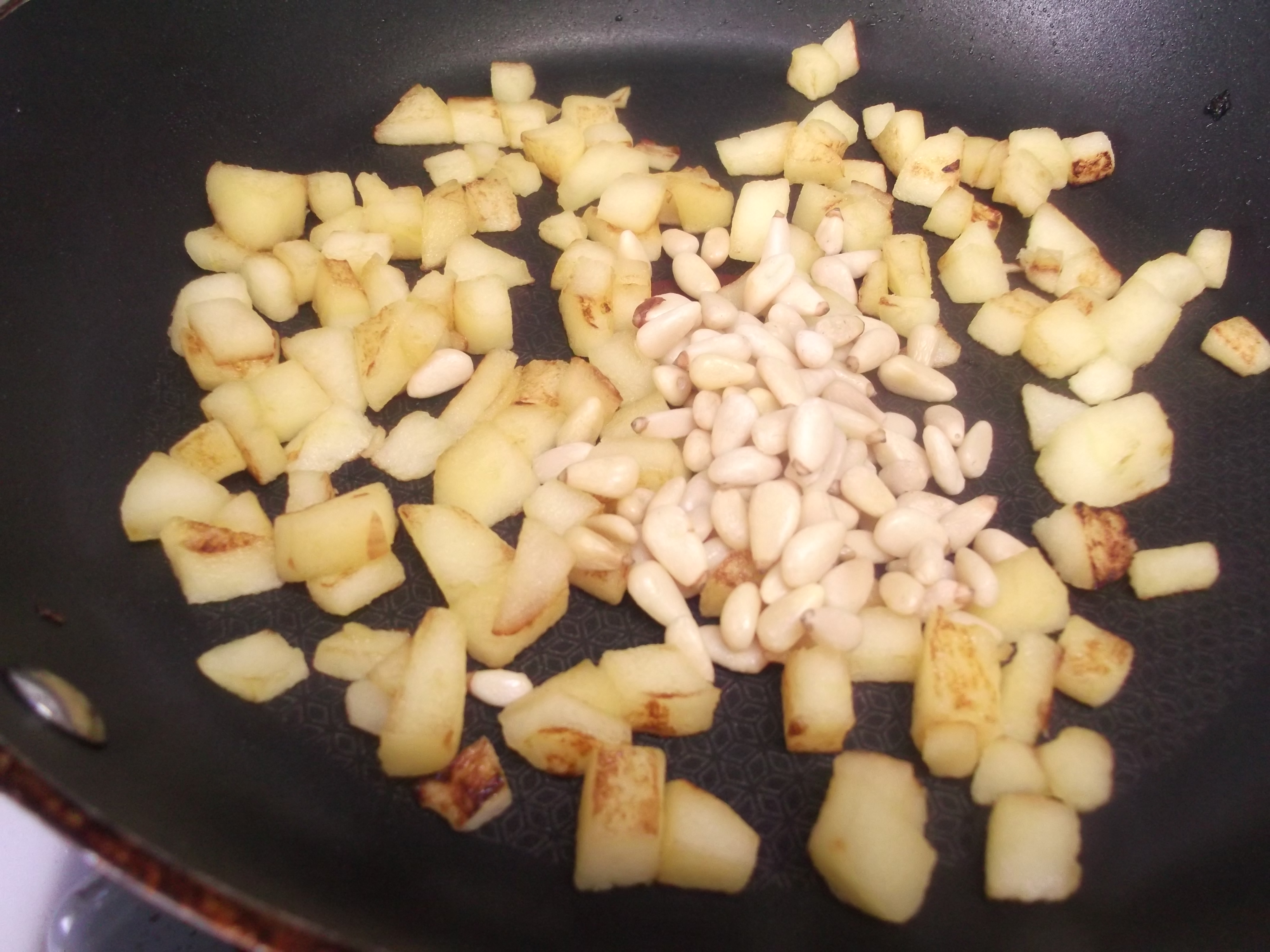 Heat the olive oil, and once it is very hot, add the apple cubes and cook until they are lightly browned, about 2-4 minutes. It might take longer if you have a wetter apple. Don’t worry too much about browning every side of the cube. Once most of the cubes are starting to brown, add the pine nuts.