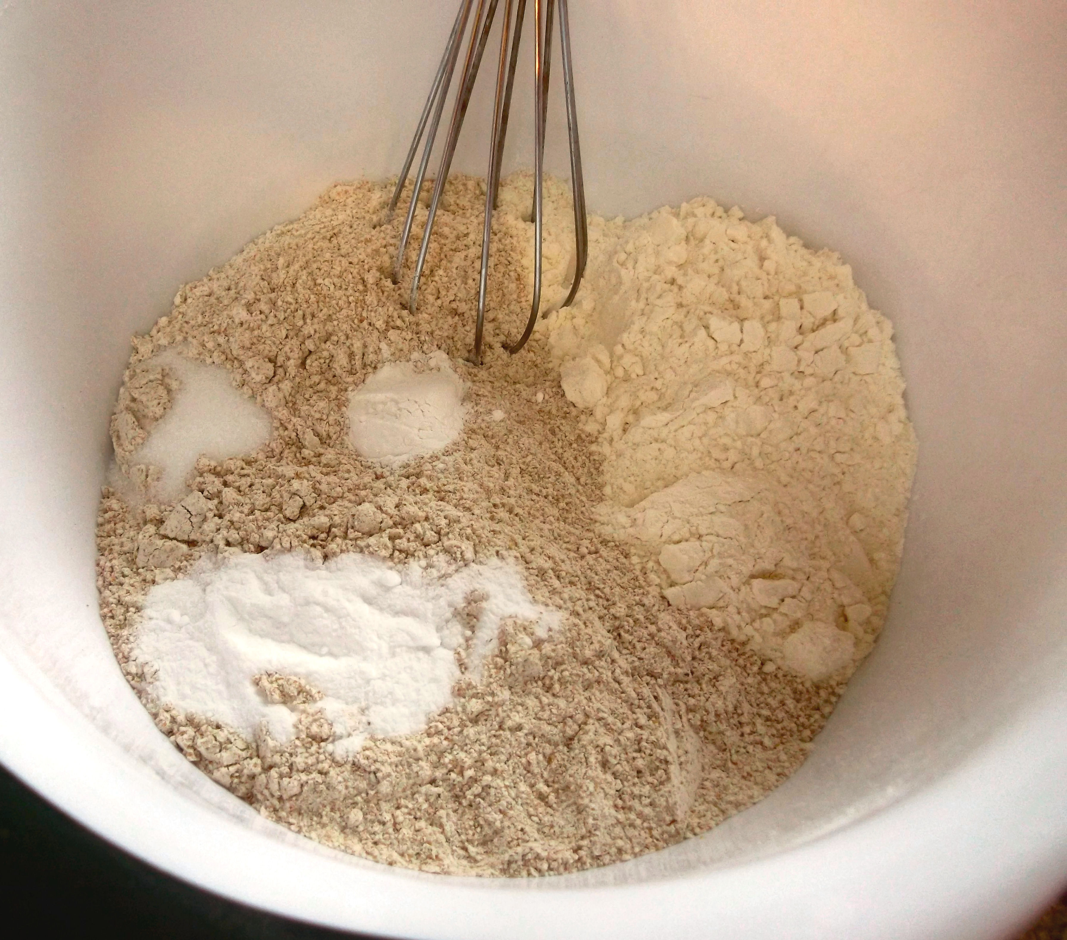 Let’s start by combining all the dry ingredients (except the nuts) in a medium bowl. Yes, I tried to make a smiley face in the flour. It didn’t turn out so well, but it’s the thought that counts.