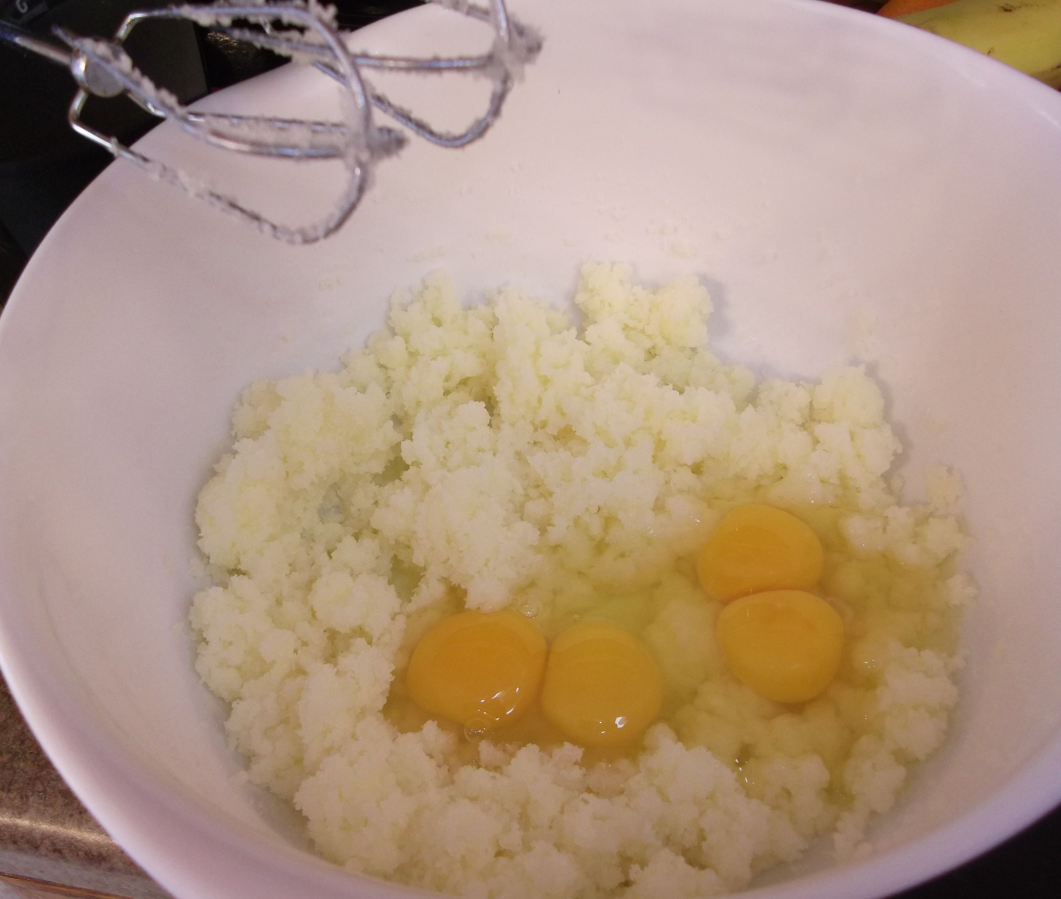 Let’s get cooking! Using an electric mixer on high, mix the butter and sugar in a large bowl. Mix them really well, then add in the two eggs and mix well until blended. (Note: I was making a double batch here, so there are four eggs. I usually end up making a double batch, as I usually have a lot of bananas to use up.)