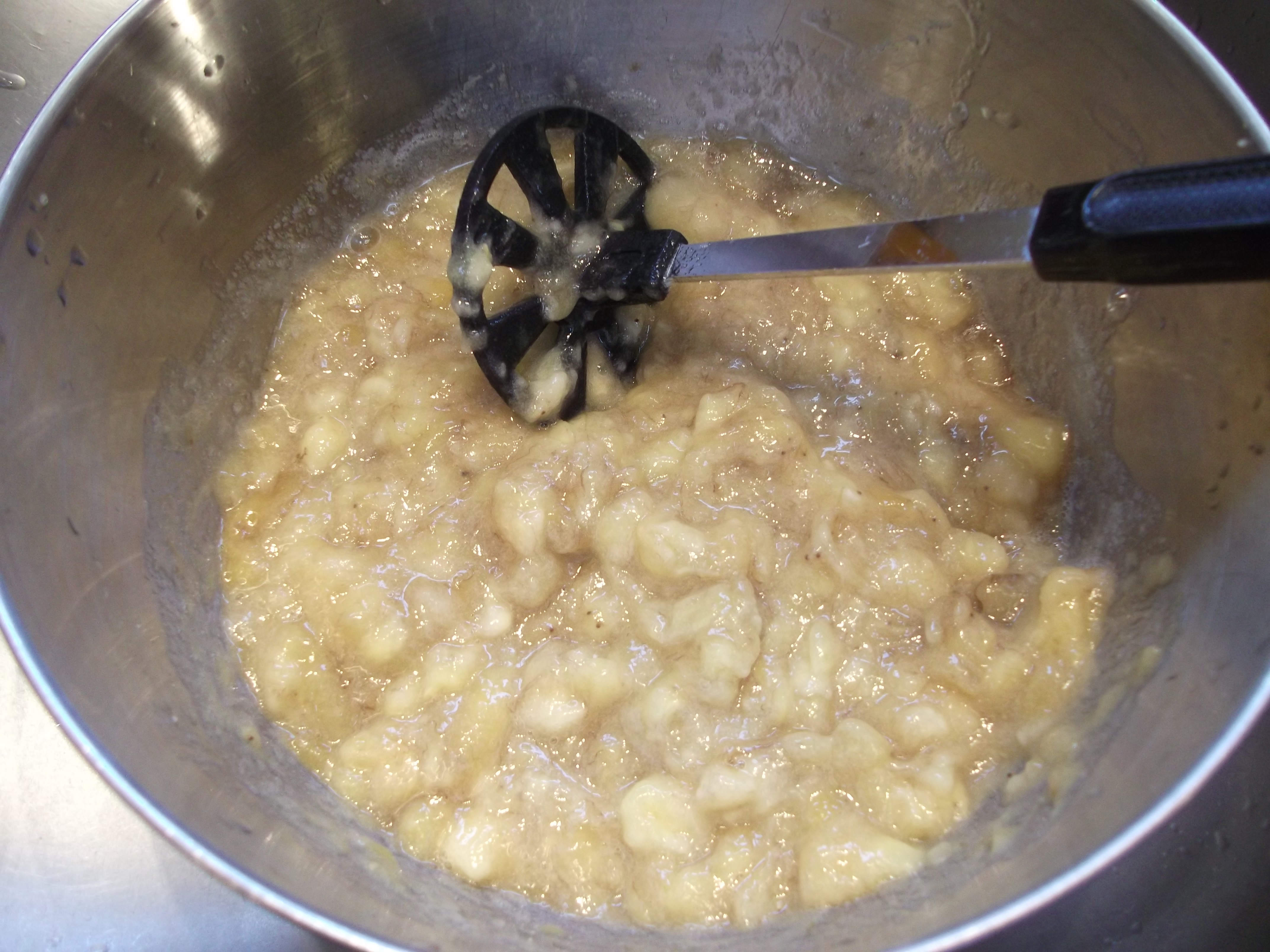 In a small bowl, mash the bananas with a potato masher. The recipe calls for a little water to be added in this step, but I only add the water if I am using fresh (not frozen) bananas. The thawed frozen ones seem pretty watery on their own, so I don’t add the water to those.