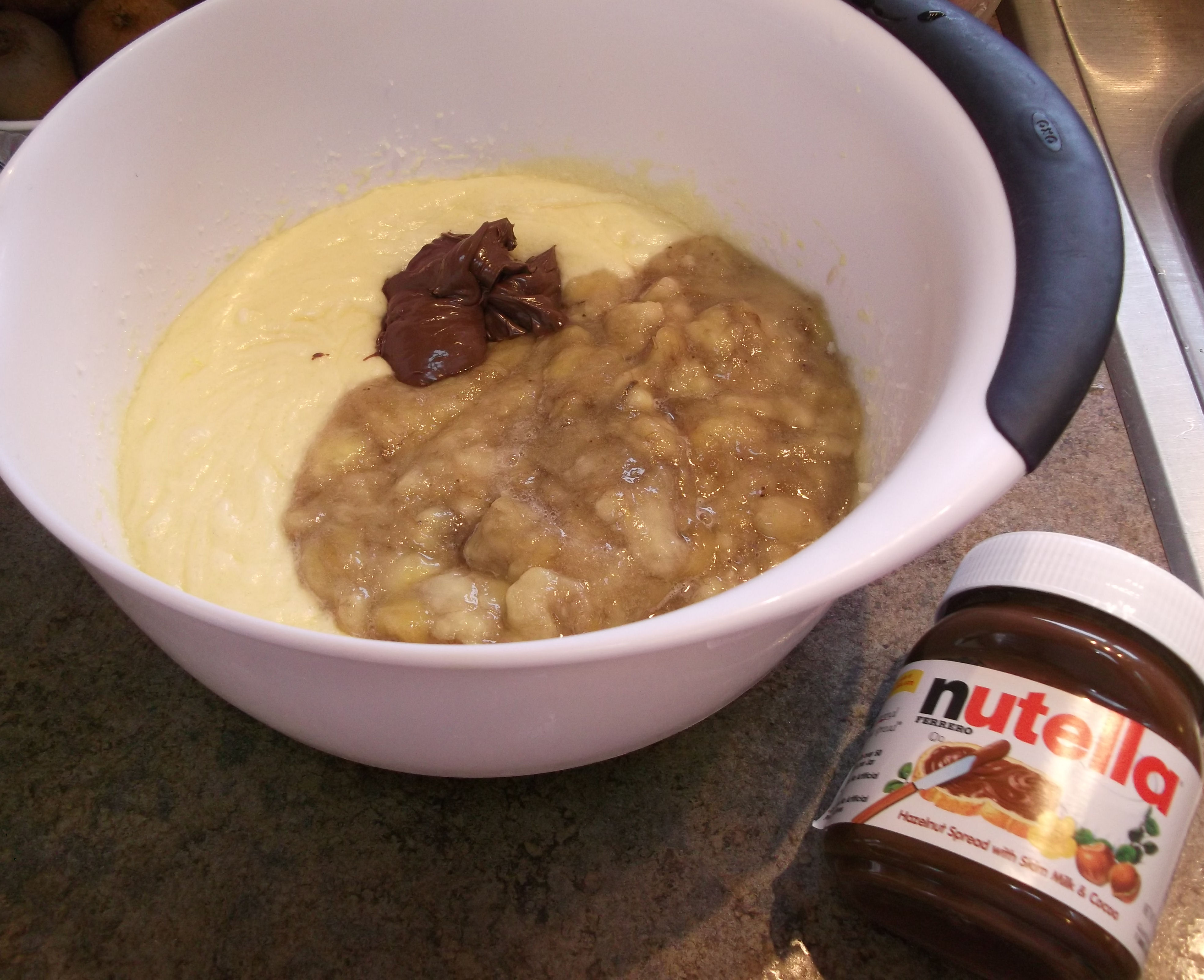 Preheat oven to 350 F and spray an 8” or 9” loaf pan with cooking spray. Mix butter and sugar in a large bowl. Mix in eggs until blended. Add bananas, water (if using), Nutella, and beat for 30 seconds. Add remaining dry ingredients — except the nuts ‑‑ and stir just until moistened. Then stir in the nuts.