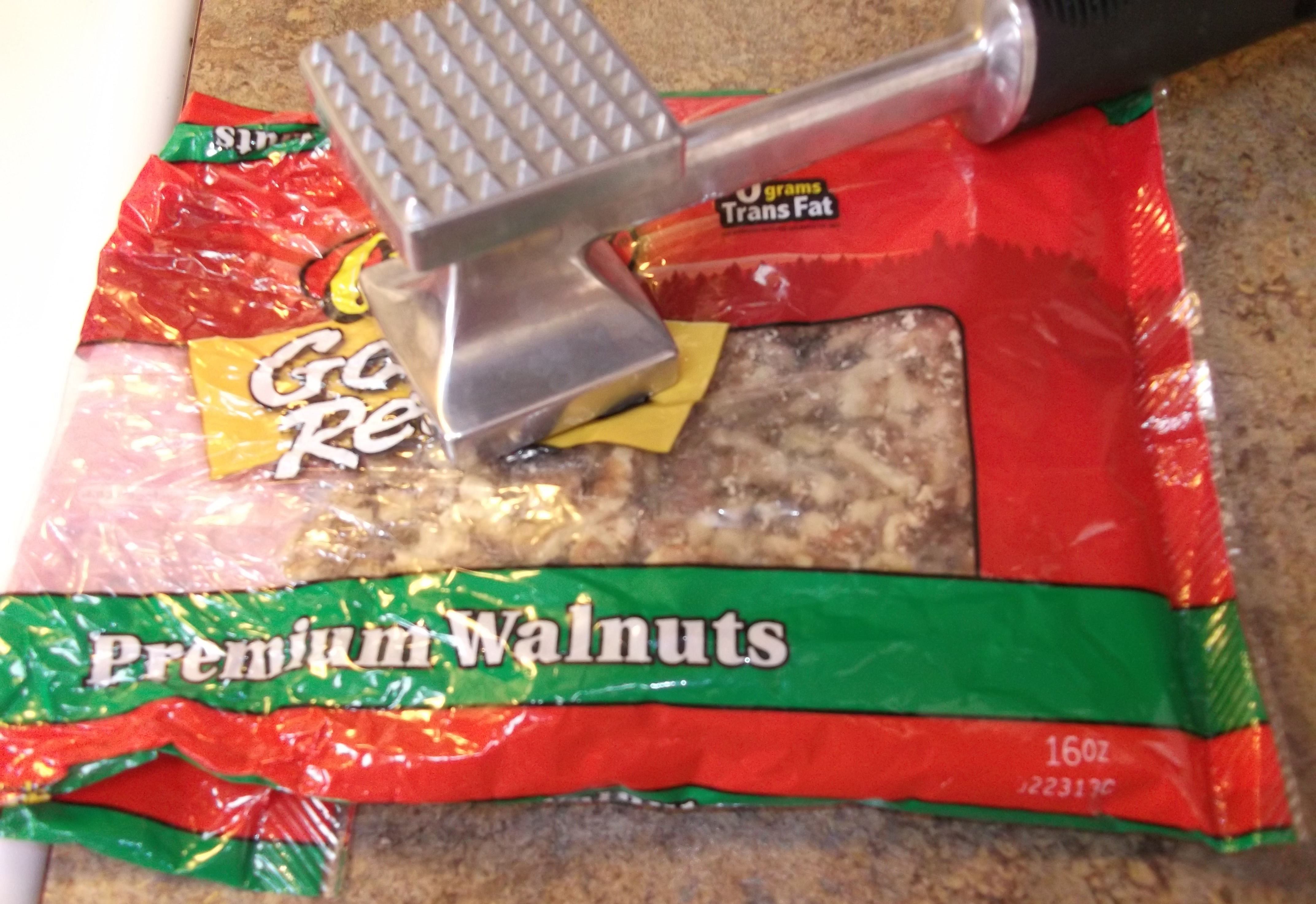 Set the bananas aside. Now let’s crush the walnuts. I use a meat mallet and crush them right in the bag. Use the smooth side of the mallet, or you’ll poke a bunch of holes in the bag, and that doesn’t help anything.