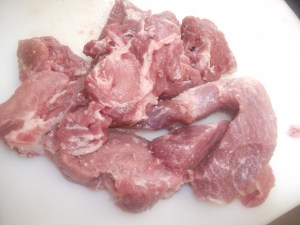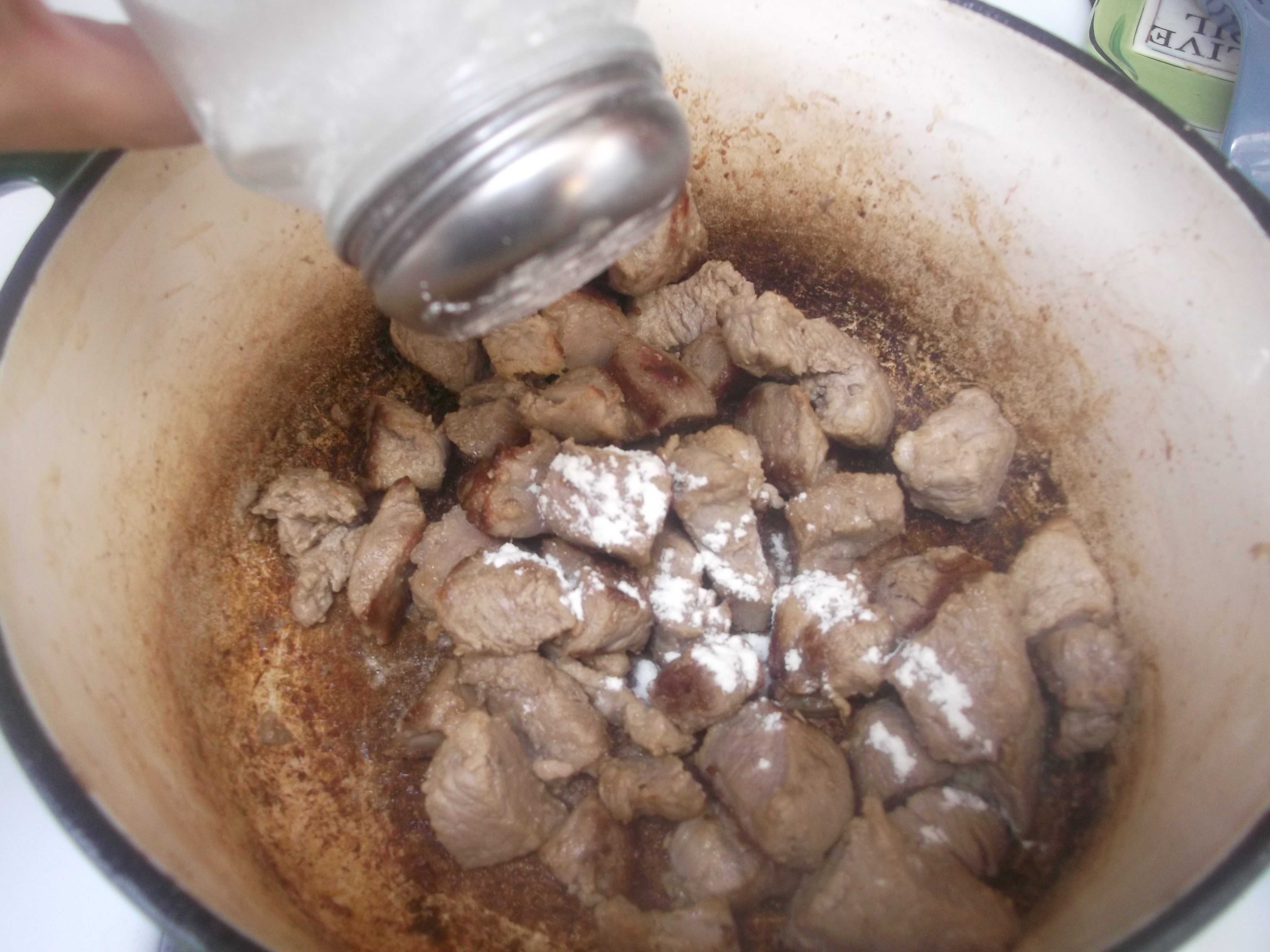 Heat oil and add the pork. Brown it on all sides, then add the flour and stir to coat.