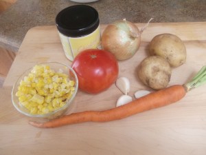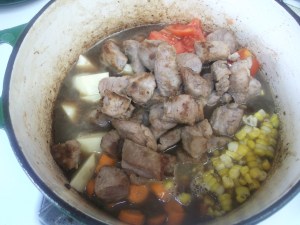 Dice the pork into ½” cubes, and do the same with the onion, potato, tomato and carrot. Set those aside and measure out the chile peppers. I freeze my roasted peppers, so I used those, also cut into roughly ½” pieces.