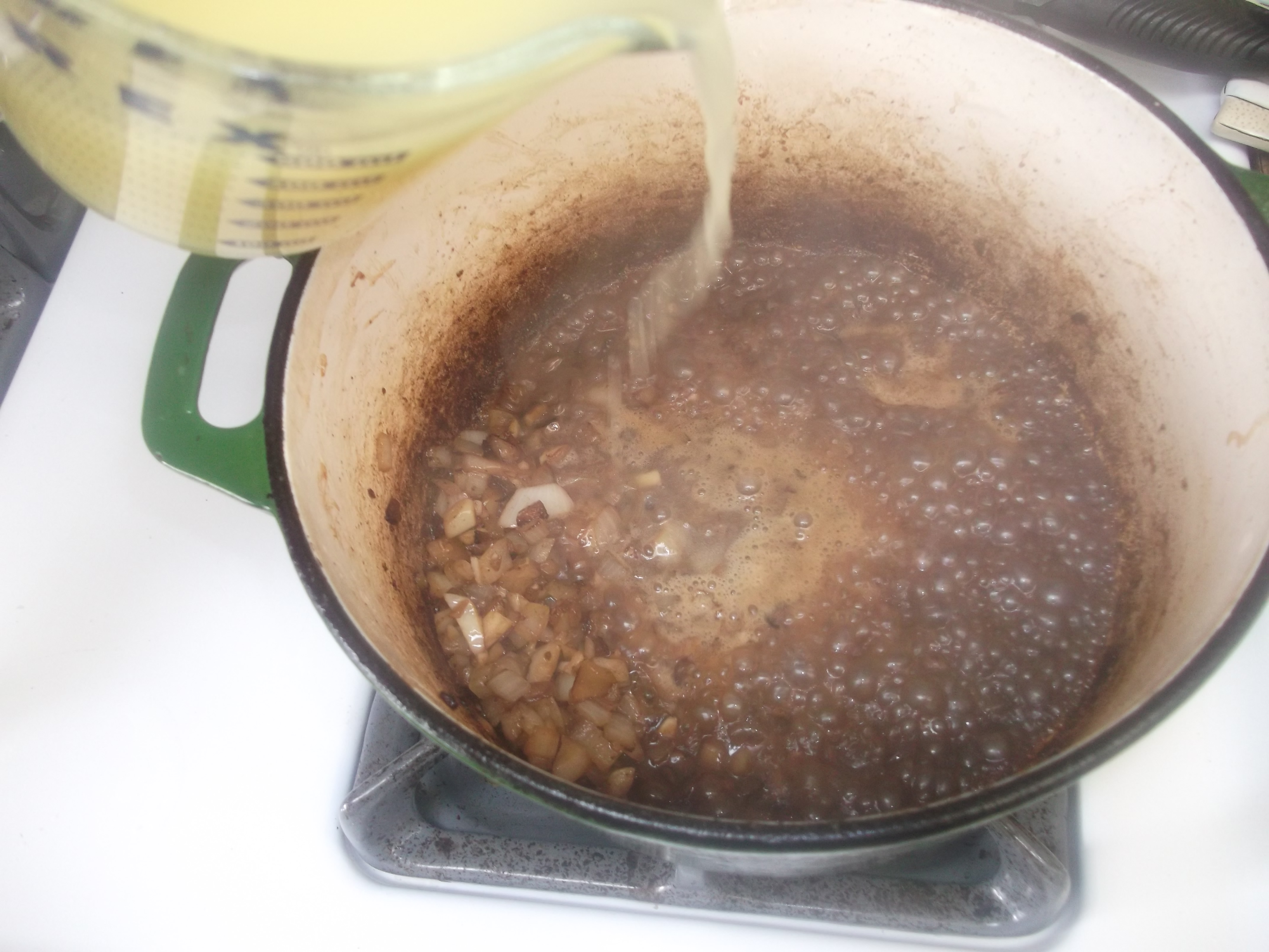 Cook, stirring, 1-2 minutes, until aromatic. And by “aromatic” I mean that the mouthwatering aromas of onion and garlic and pork will start filling your home. Don’t let that distract you, though. The aromas will just keep getting better. Slowly pour in the chicken stock.