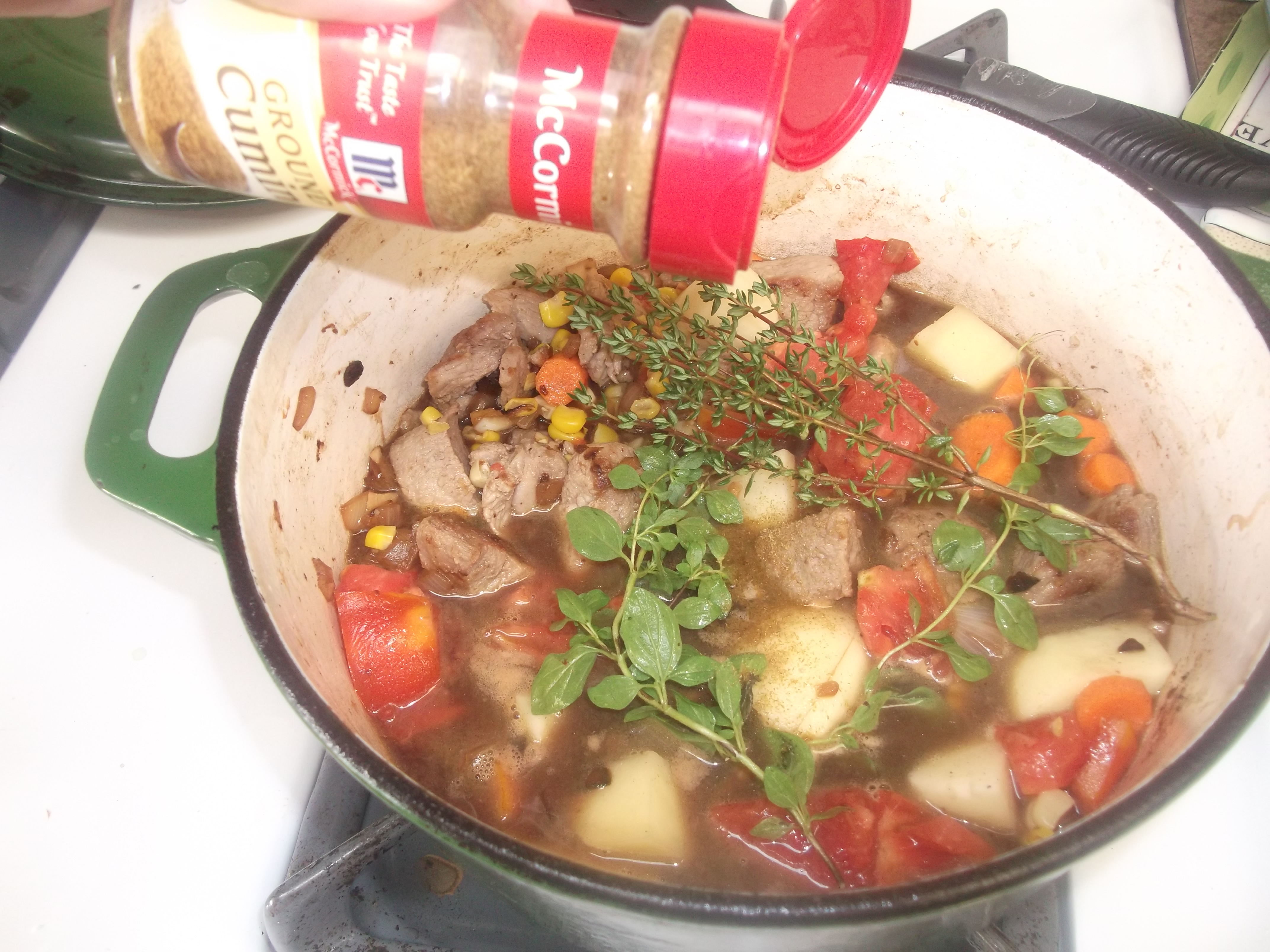 Add the fresh herbs and cumin, but not the chile peppers. Not quite yet.