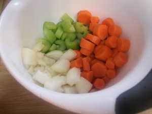 While the steaks are browning, mince enough garlic to get about a tablespoon’s worth, and chop the vegetables coarsely (roughly ½” pieces). This will yield roughly a giant handful of each.