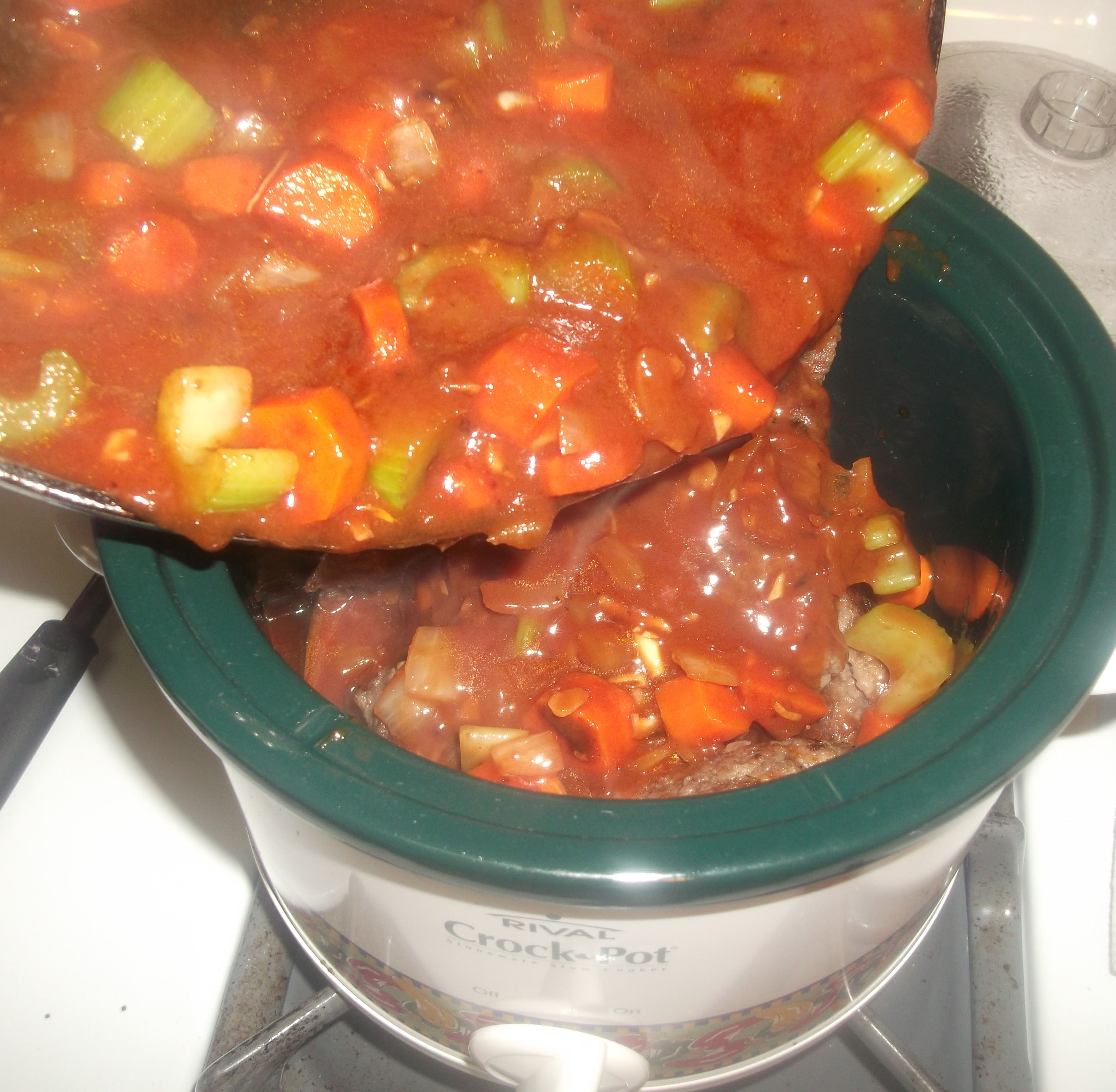 Add a little more oil if the pan is dry, and stir in the vegetables. Let them cook for a few minutes, then add the garlic: stir it in well and be careful not to let it burn. Add the Lipton’s packet and pour in one can of tomato juice/V8. Stir well to mix, and scrape up all the bits from the bottom of the pan. Pour the mixture into preheated crock pot. Top off the crock pot with tomato juice/V8 until the meat is completely covered. Cook on low 8-10 hours, or high 5-6 hours.