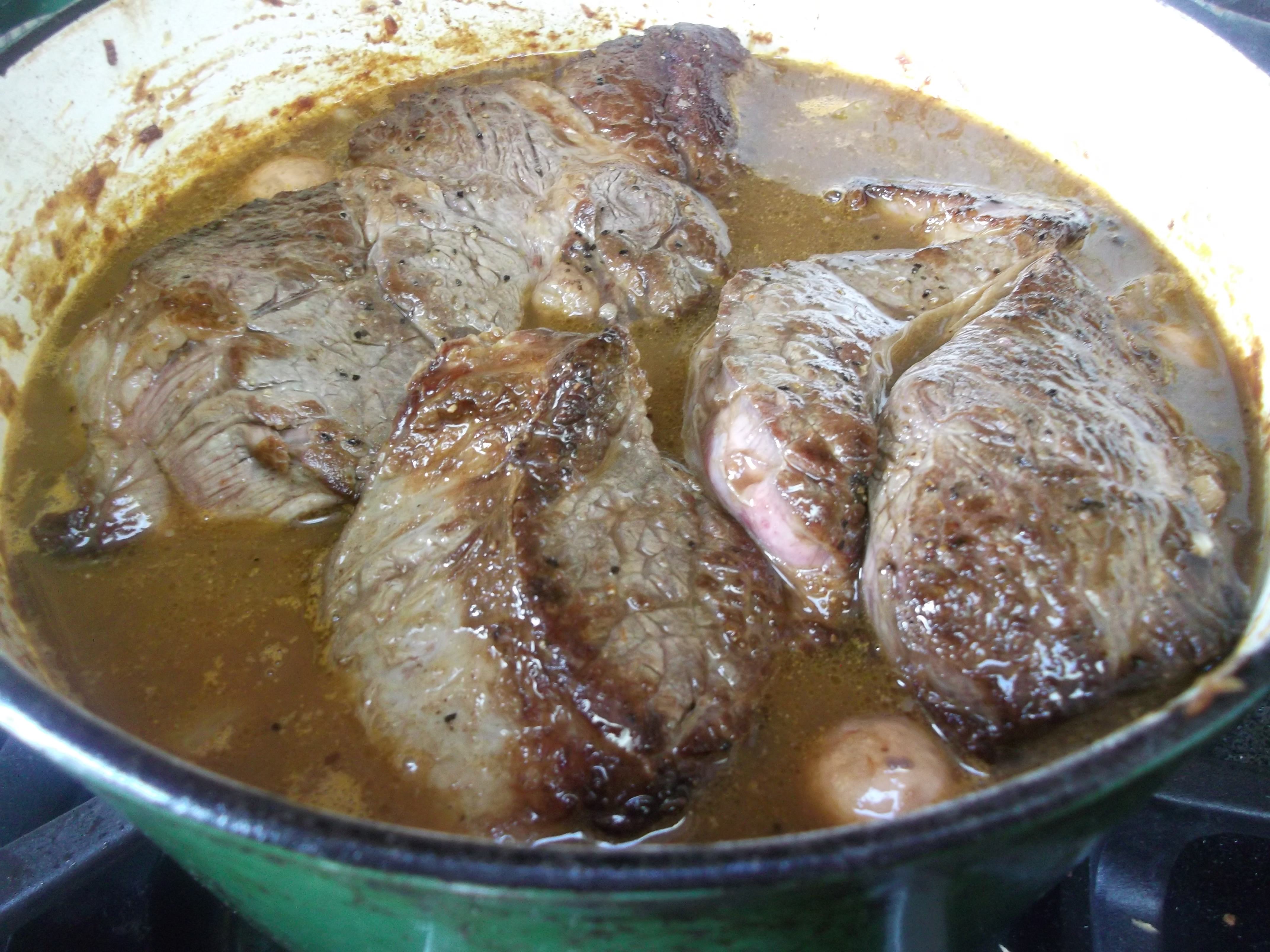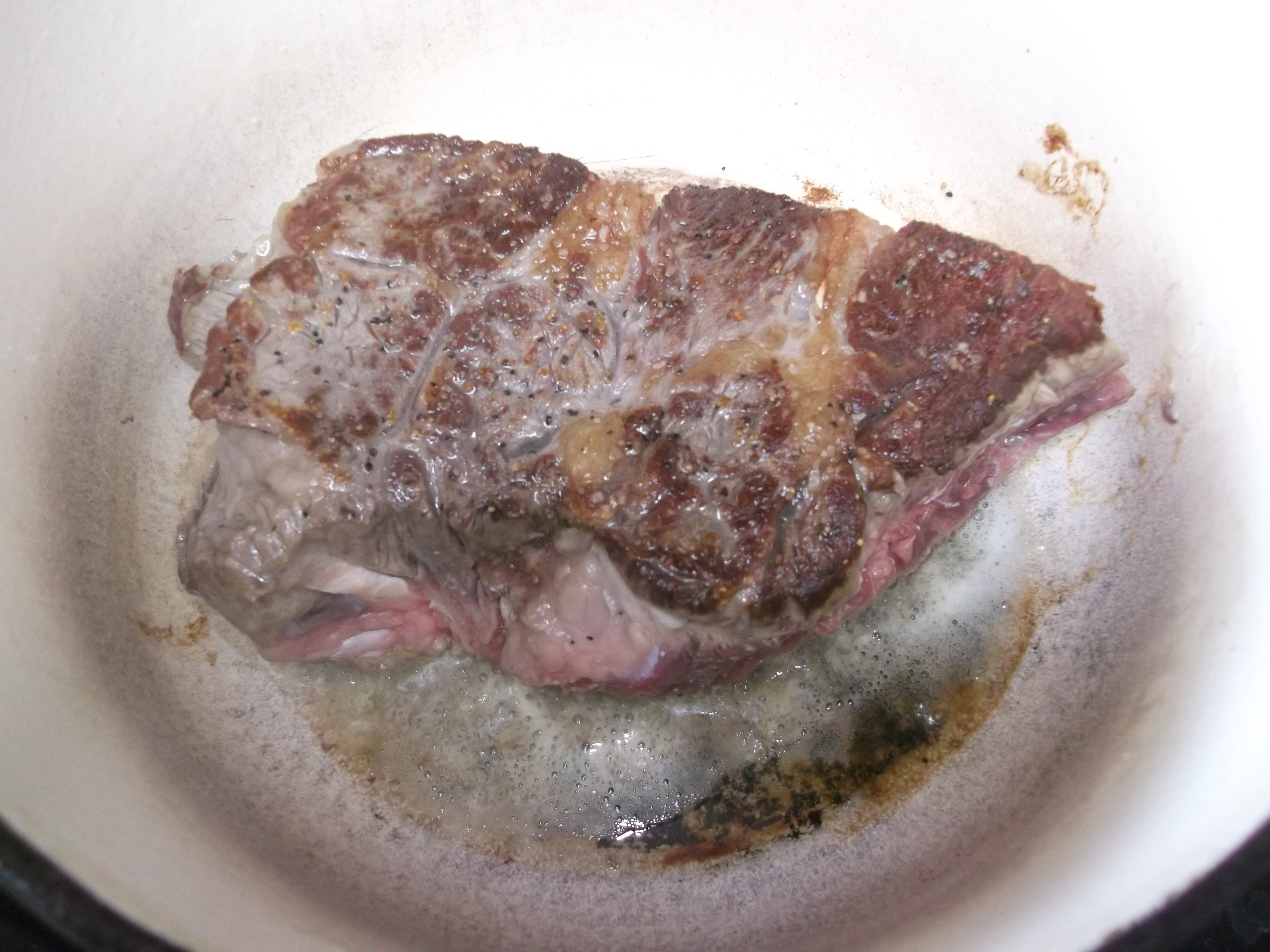 Sear the meat about 5 minutes on each side, until a nice brown color develops. Even do the edges, if you can get it to stand up without falling over. You’ll also get some browning on the bottom of the pot, which will add extra flavor to the gravy, later. When you can move the meat freely across the bottom of the pan, it’s ready to turn to another side. If it sticks, it’s still working on its sear and is not quite ready to be turned.