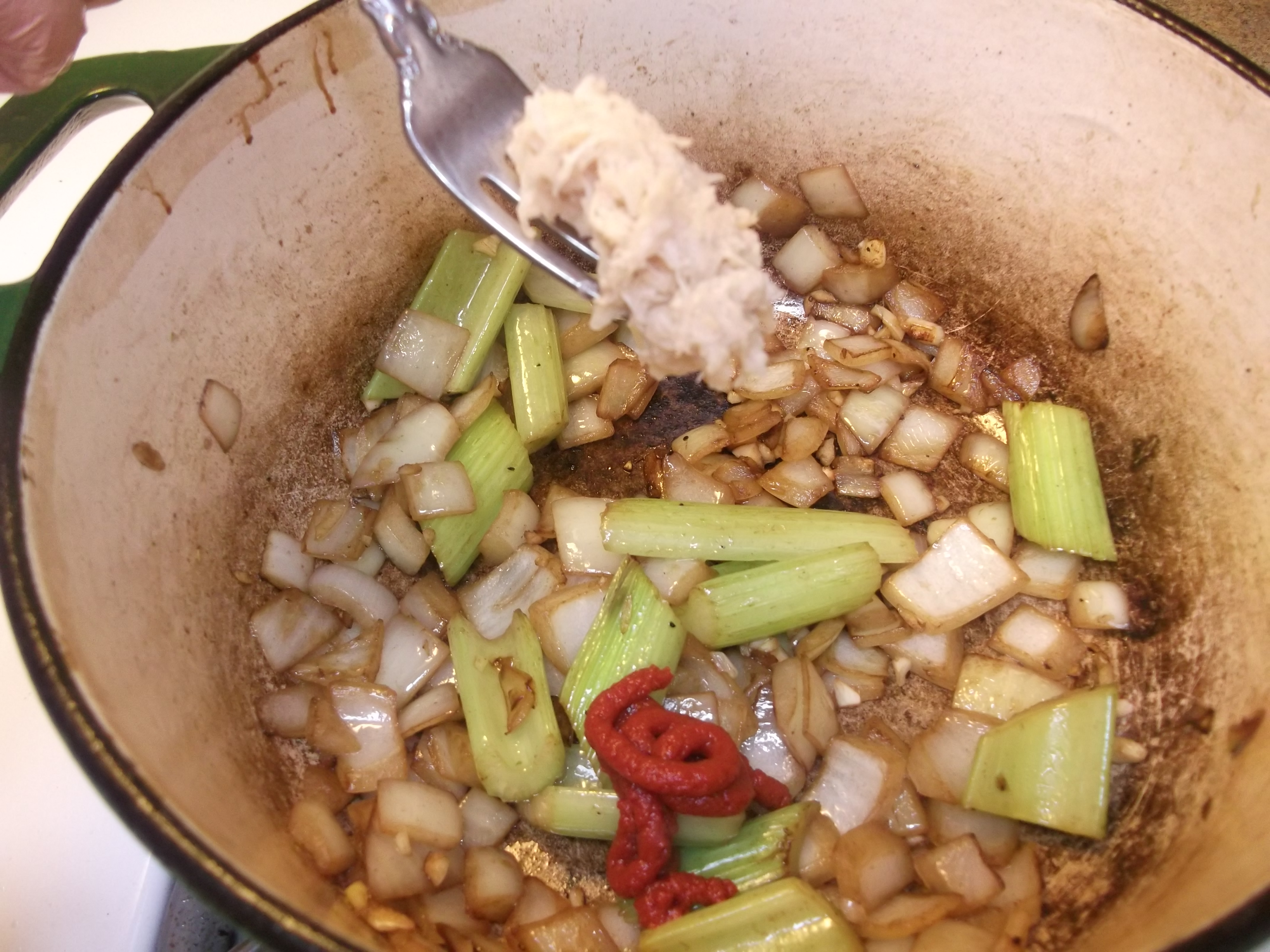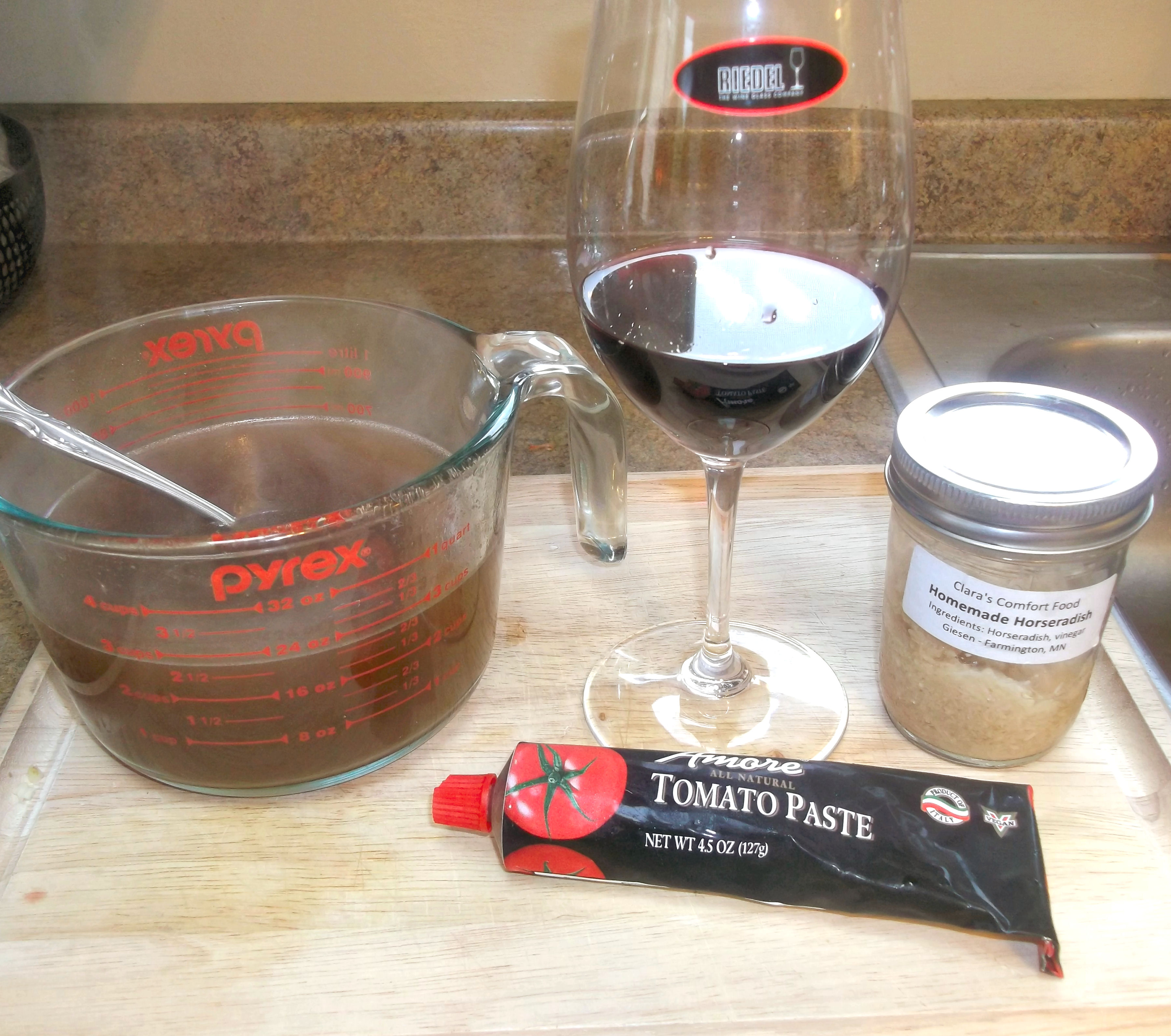Add the remaining oil and reduce heat to medium. Add the onion and celery and sauté until lightly browned, about 3 to 5 minutes. Then add the garlic, tomato paste and horseradish. Stir for a minute or so, or until it loses its pungency. Add the wine and cook until it has nearly evaporated.