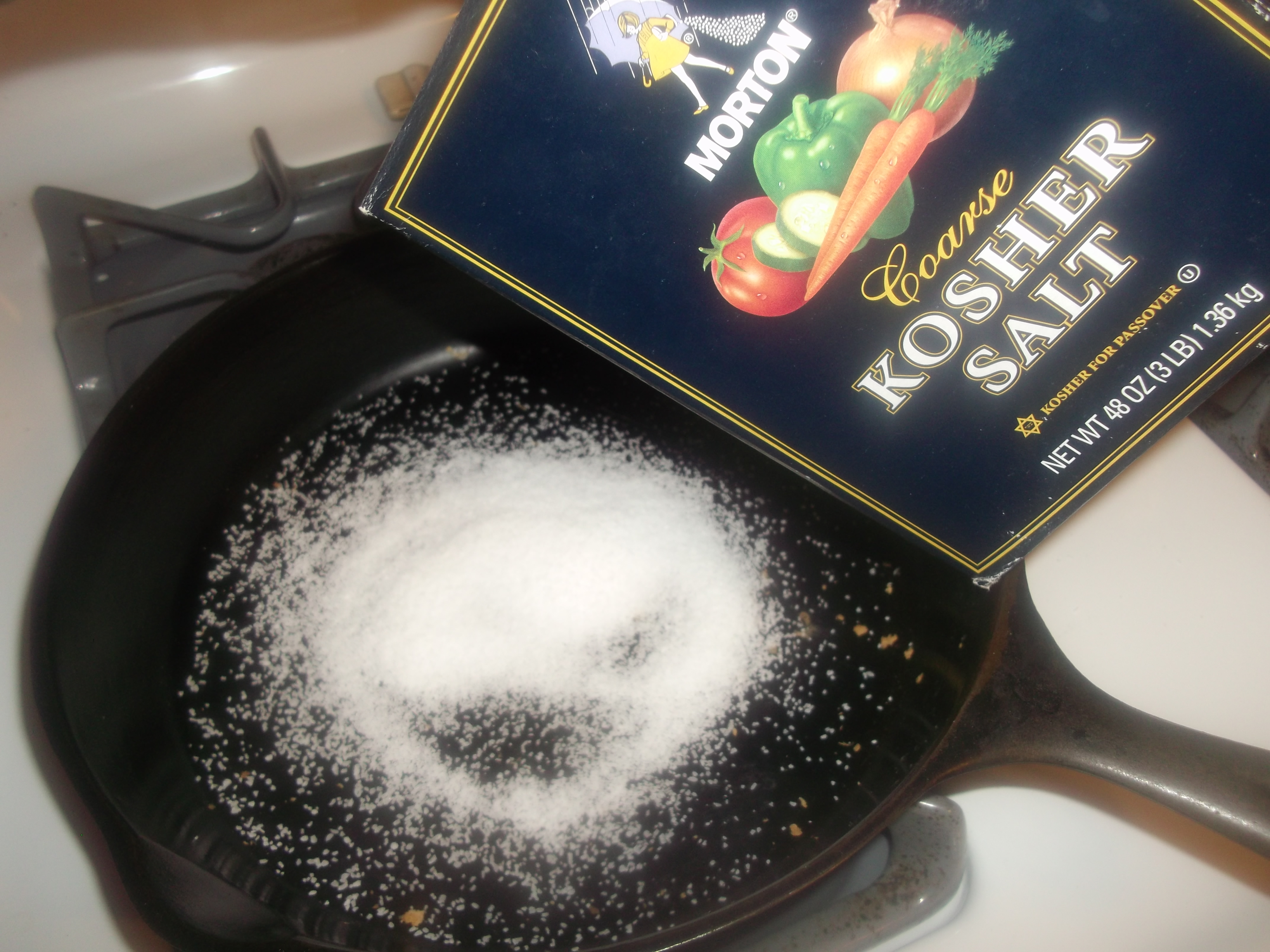 Take a clean DRY dishrag (remember, keep water and all things wet away from cast iron!) and rub the paste all around the pan. The grit from the salt will scrape up any dried food, or even any rust spots if you exposed your pan to water prior to reading this tip.