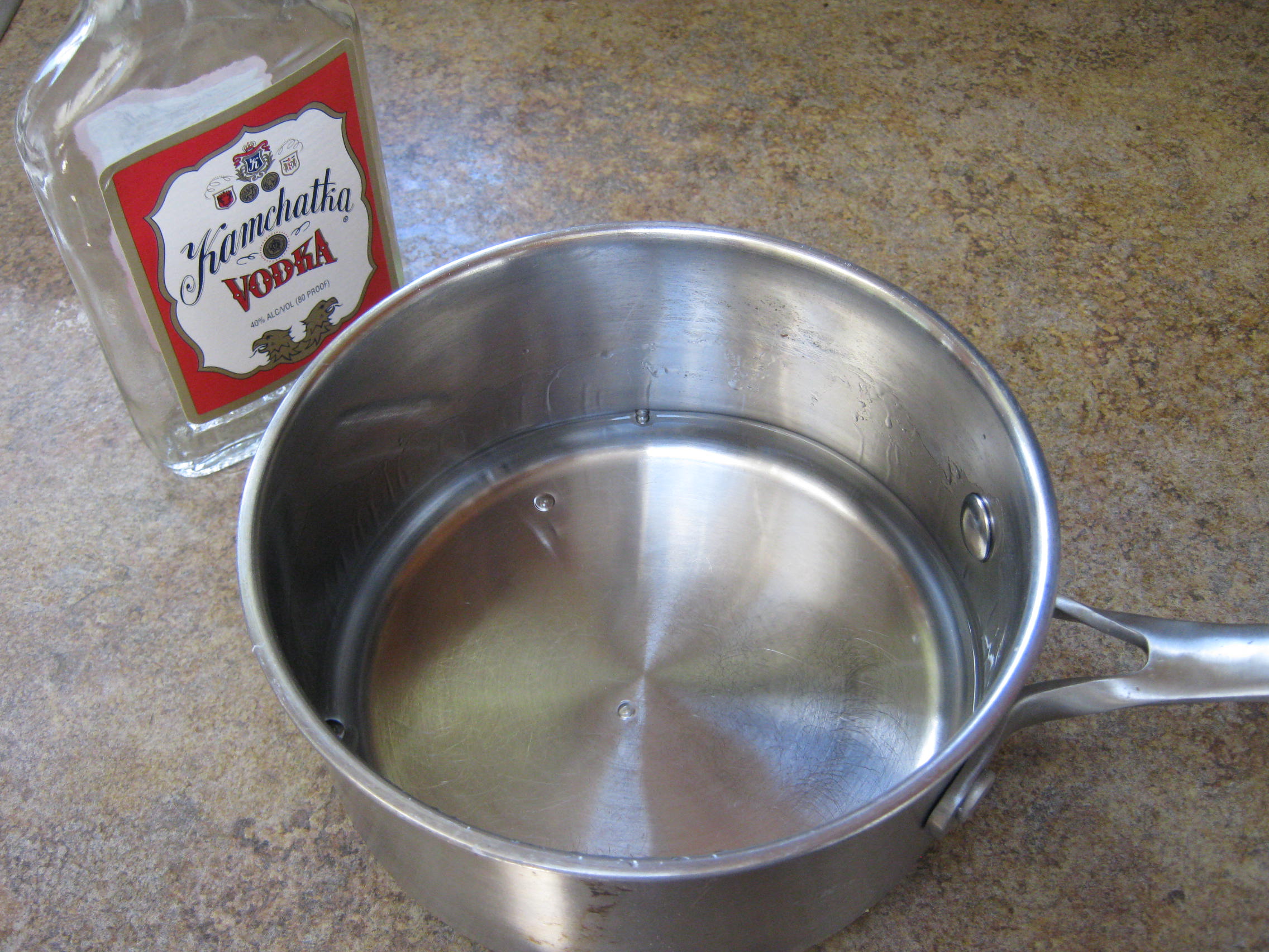 Slowly heat the saucepan of vodka over medium heat. Be very careful: the fumes can catch fire, so make sure there isn’t anything flammable nearby. When hot, pour the vodka through a funnel back into the bottle.