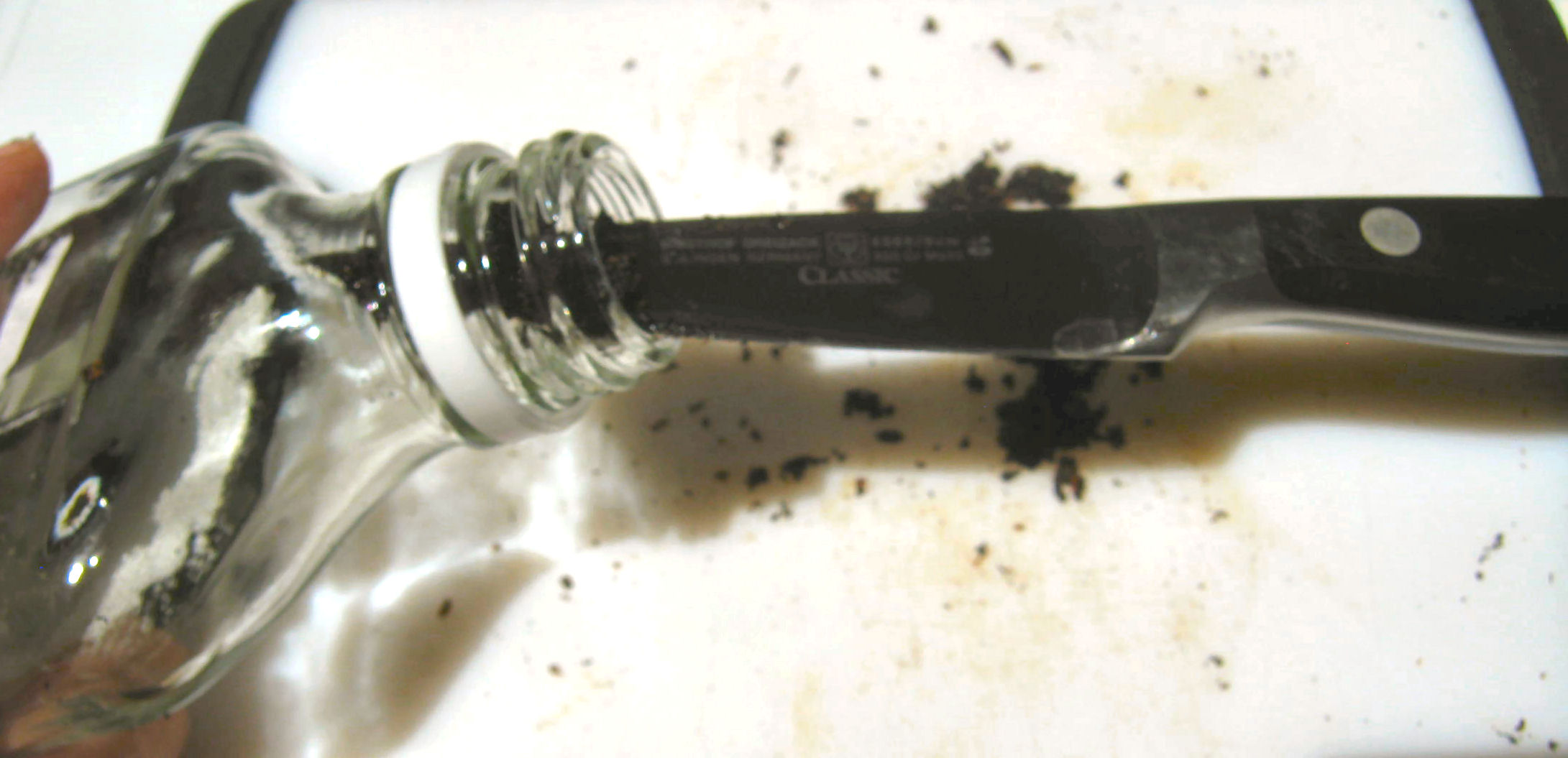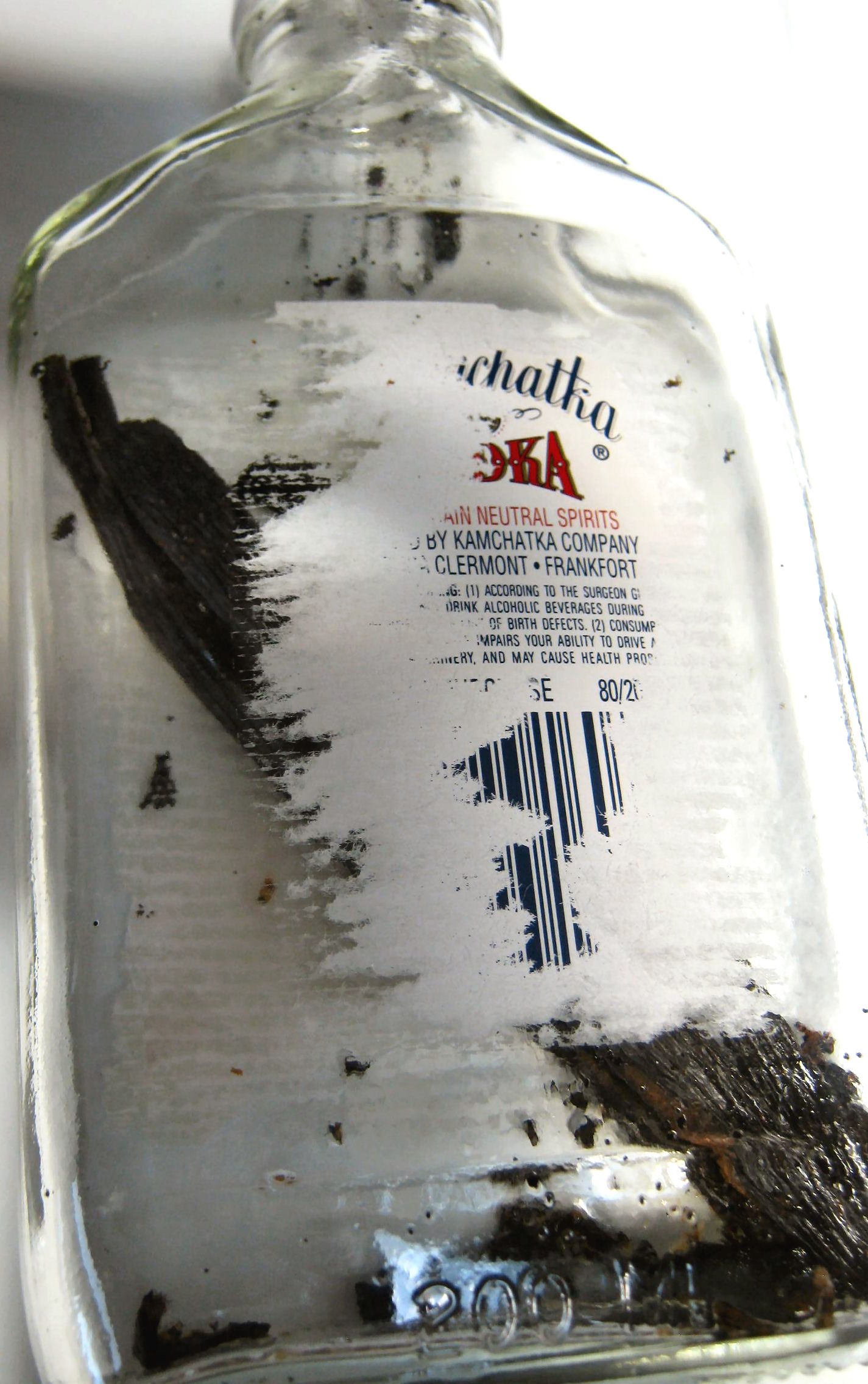 Place the scraped bean pods in the empty vodka bottle, along with all the seeds and pulp.