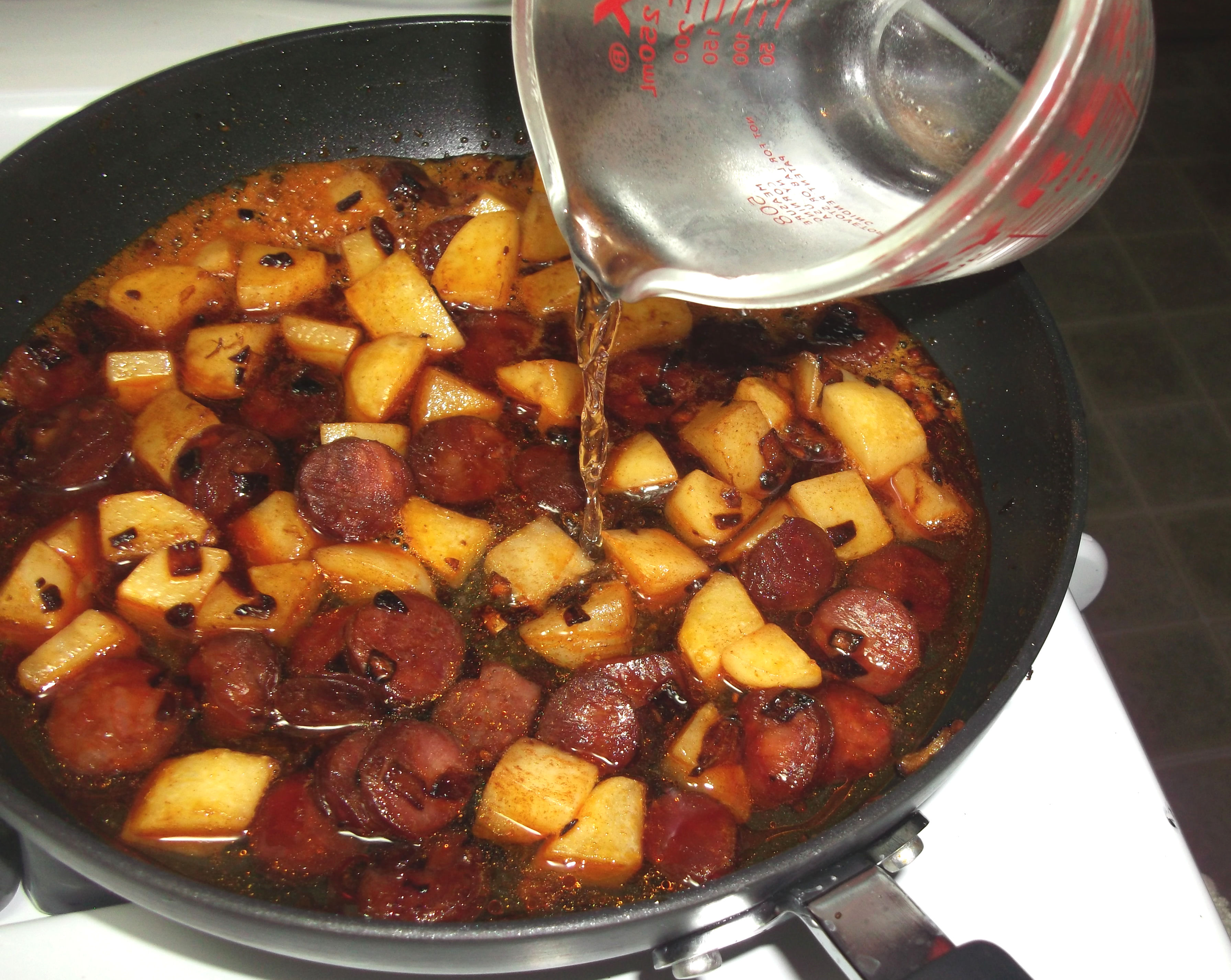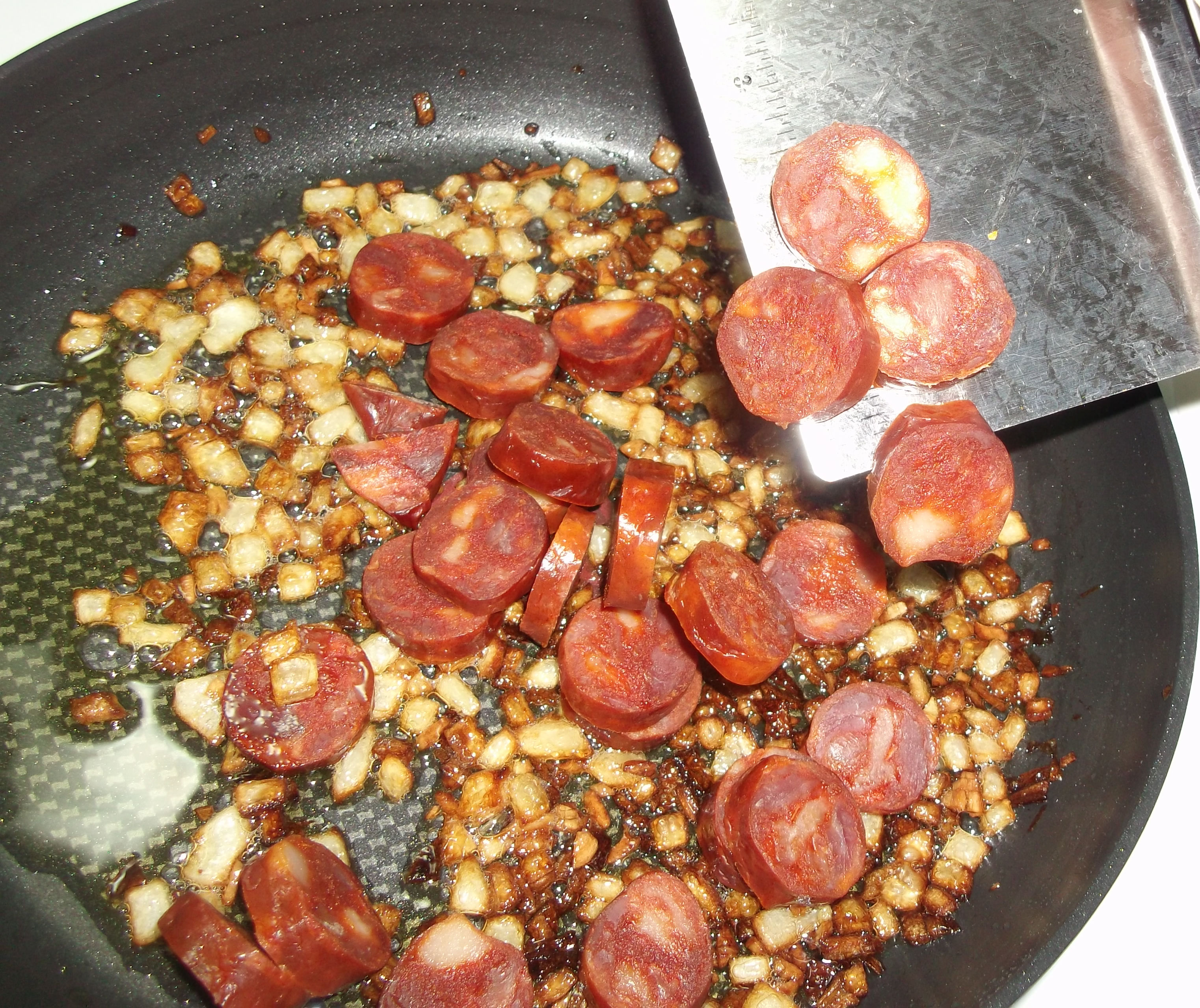 1. It was absolutely delicious! I sauteed some diced yellow pepper along with the onions to boost the vegetable content; that was a nice addition and a pretty color complement to the dark red of the chorizo. I found dried chorizo in the gourmet sausage area at Lunds.