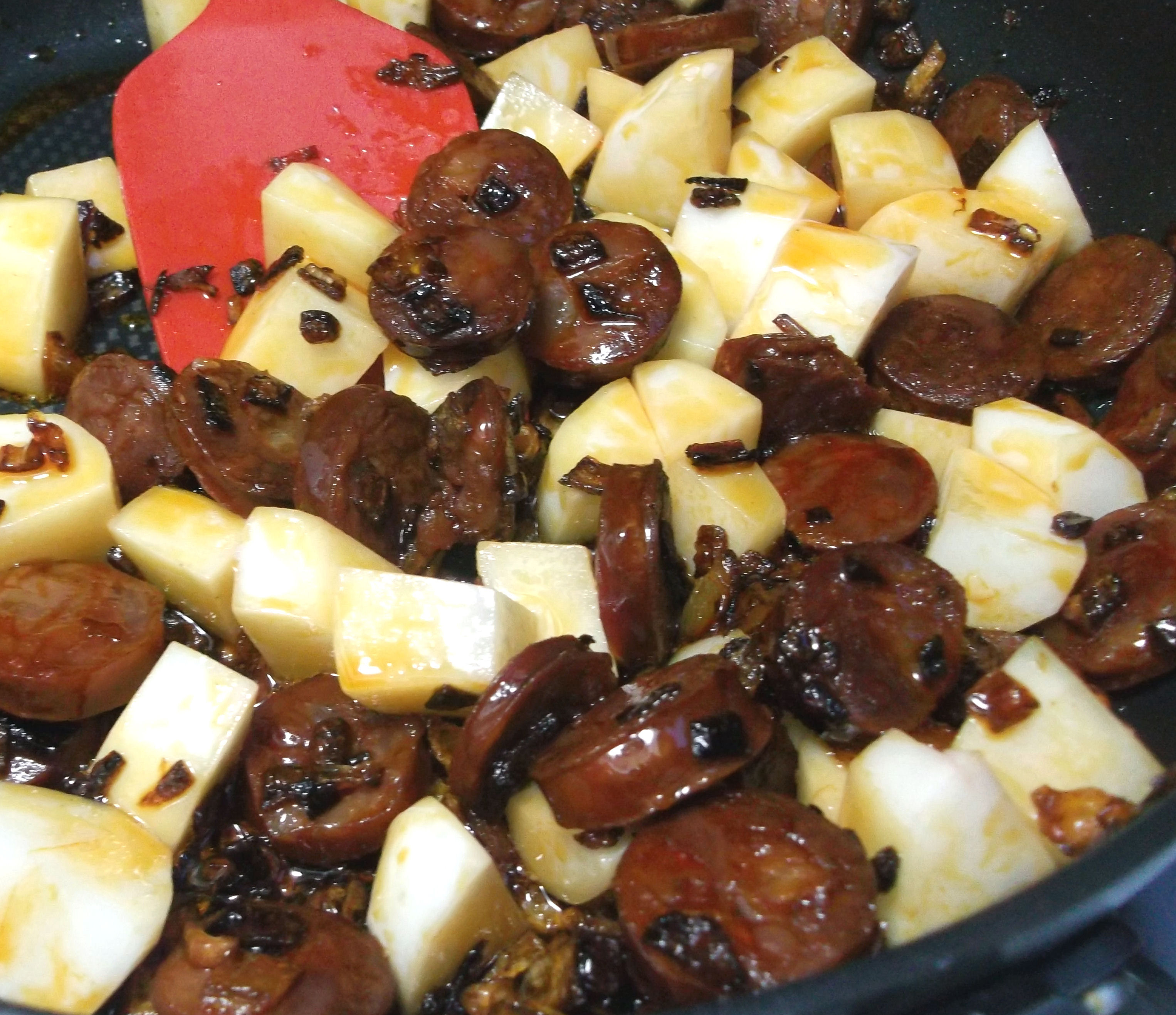 When the onions are caramelized, add the chorizo and continue frying until it too is browned, about two minutes. Add the potatoes in the pan and stir to coat them in the oil. Cook for 10 minutes.