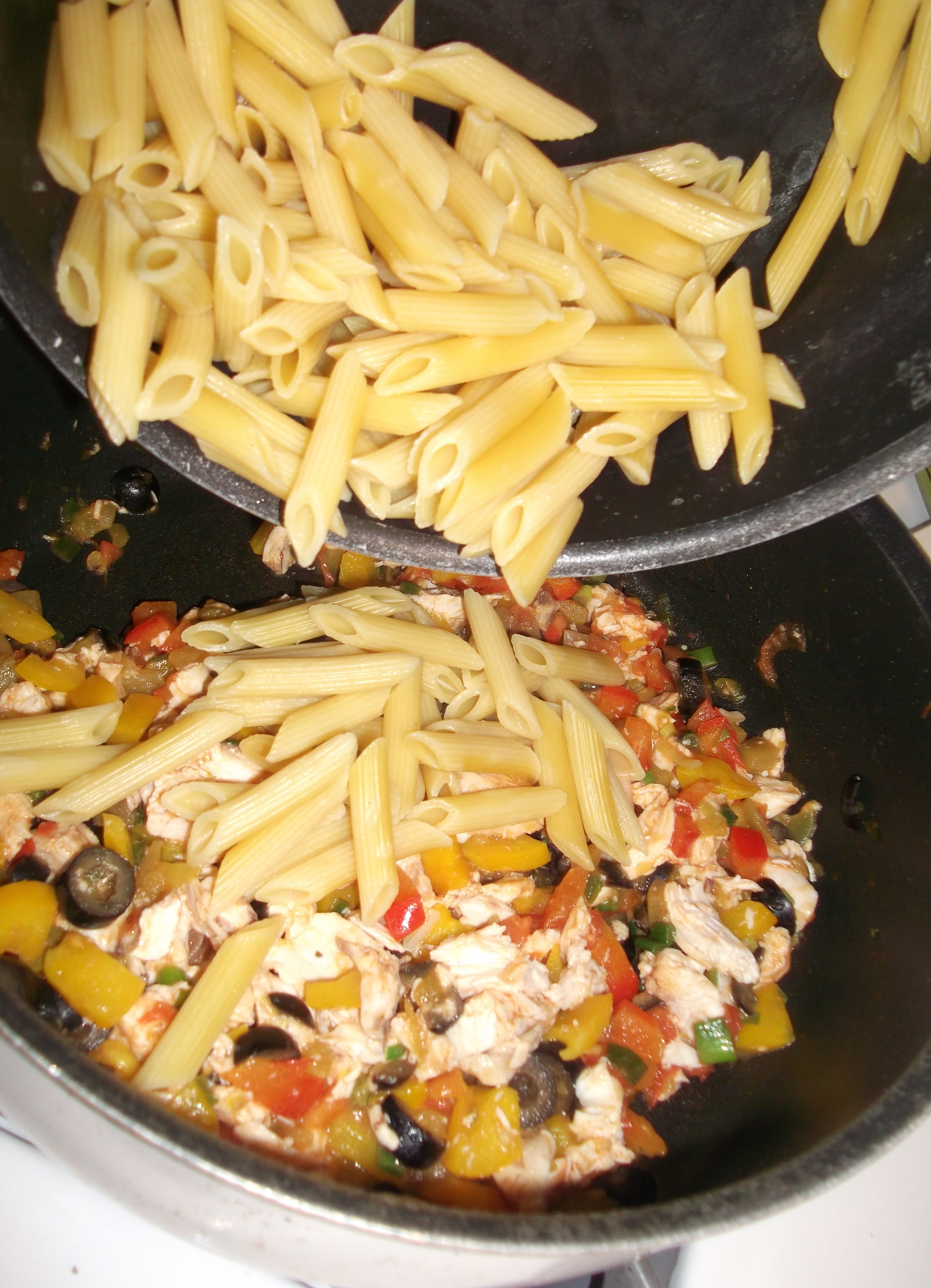 In a large pan, heat the olive oil and sauté the bell peppers, tomatoes (if using), and green onions until slightly softened, about 2-3 minutes. Add the olives and green chiles, stir to mix well. Stir in the chicken and then add the pasta. Add half of the shredded cheese, stir, and then add the enchilada sauce; mix well. If using cream cheese, add that now and stir until it’s melted; the mixture should be well blended and the pasta well coated at this point.