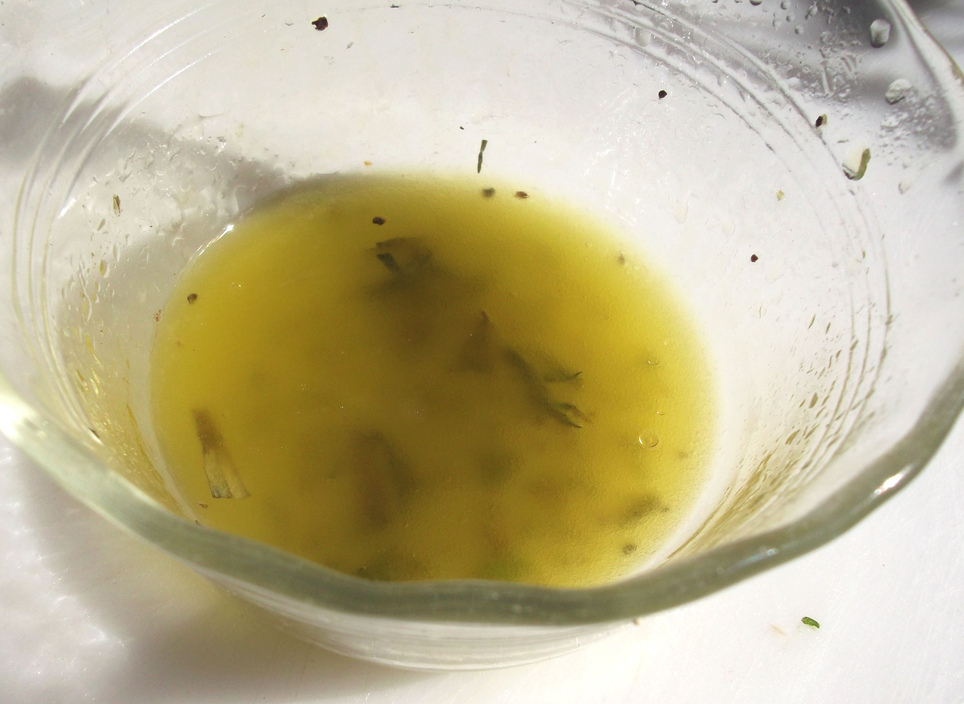 To make the lemon vinaigrette dressing, in a small bowl, mix the olive oil with the lemon juice, about ¼ t Kosher salt, and a few grinds of pepper. I even added a few pinches of dried tarragon, because I love it so much and didn’t have much fresh tarragon in my garden. Stir or whisk until completely blended. (Note: you will have more than this. I didn’t take the photo until after I used most of it. I admit, I couldn’t wait to finish making this and dig in!)