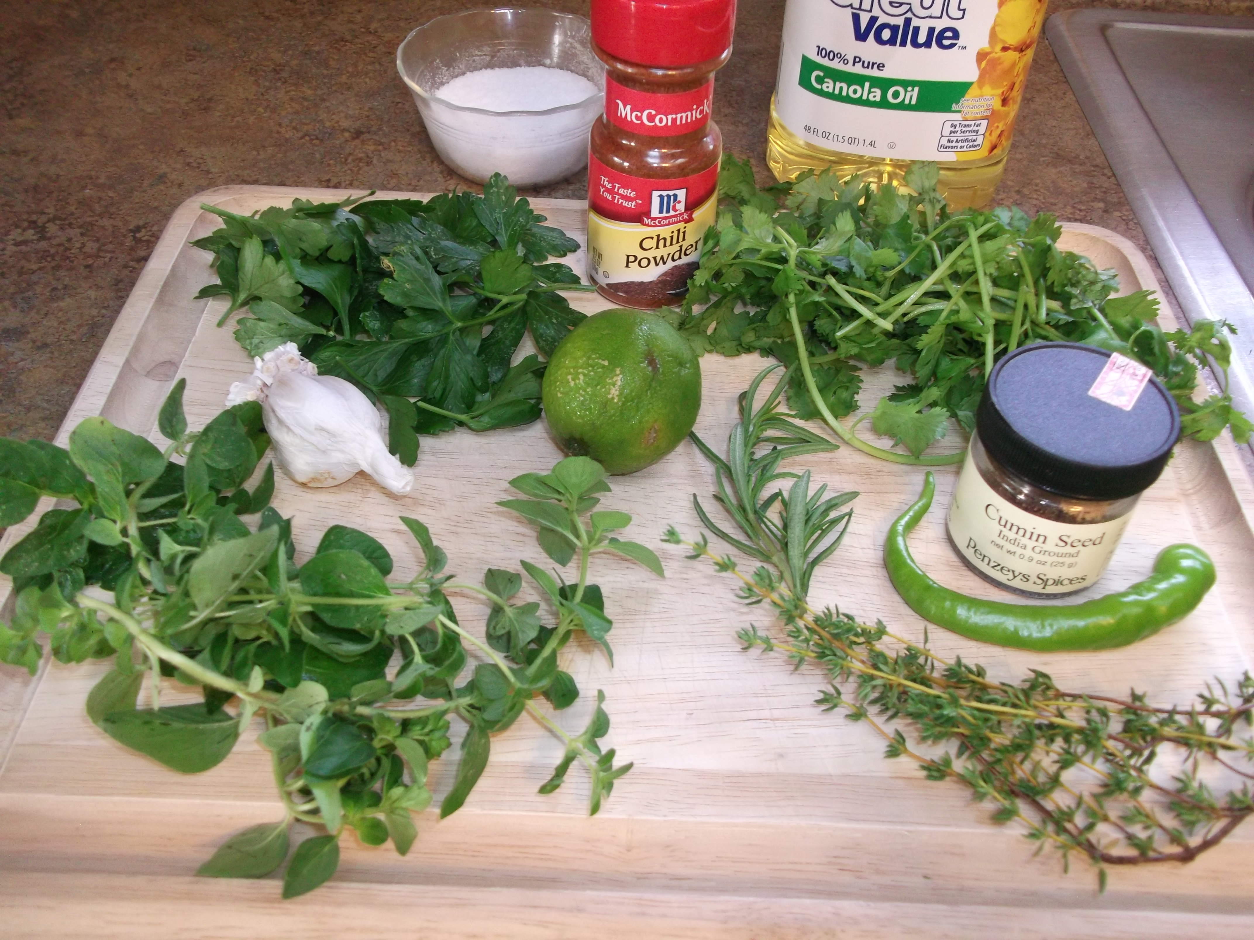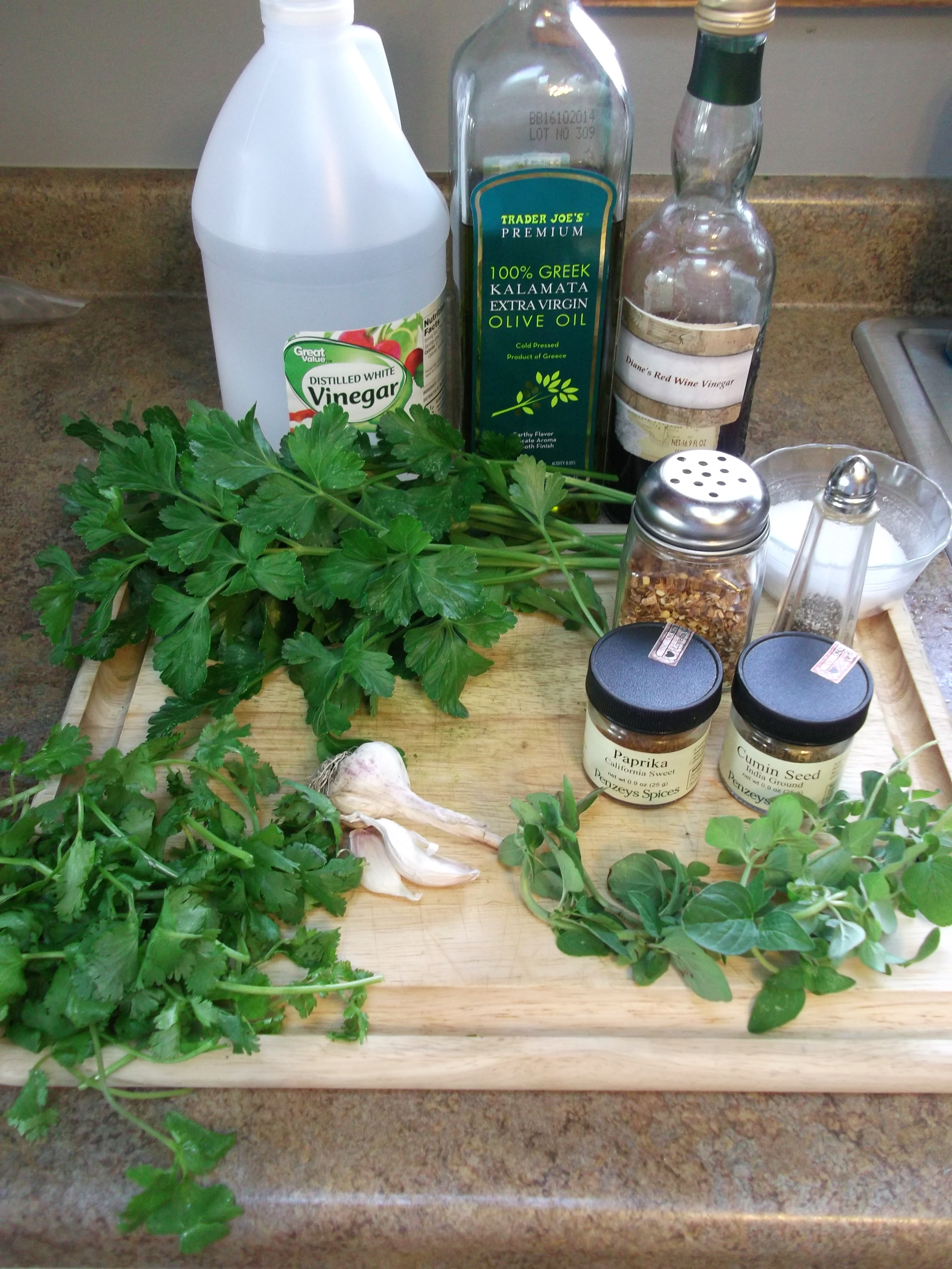 Make the chimichurri next. Before you start, be sure to use a large enough food processor to allow ample head room. I thought I could get by with my tiny one to save on clean-up. I packed it tightly and added the liquids last, but when I turned it on water and oil shot out all over the place. So much for saving time and clean-up…