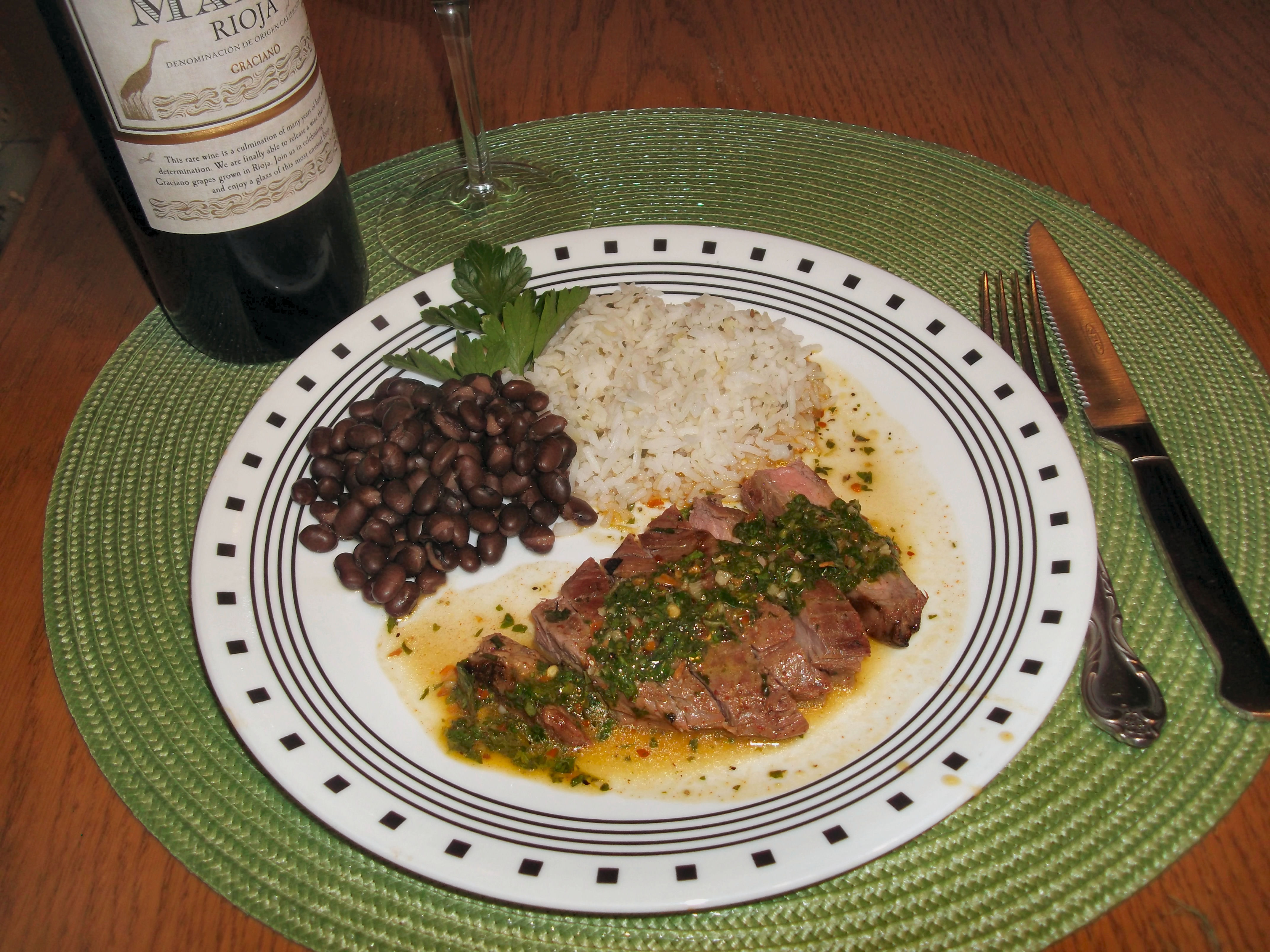 Top the sliced steak with chimichurri and serve with white rice and black beans. This meal pairs especially well with red wines like Argentinian Malbec or Spanish Rioja or Garnacha. Enjoy!