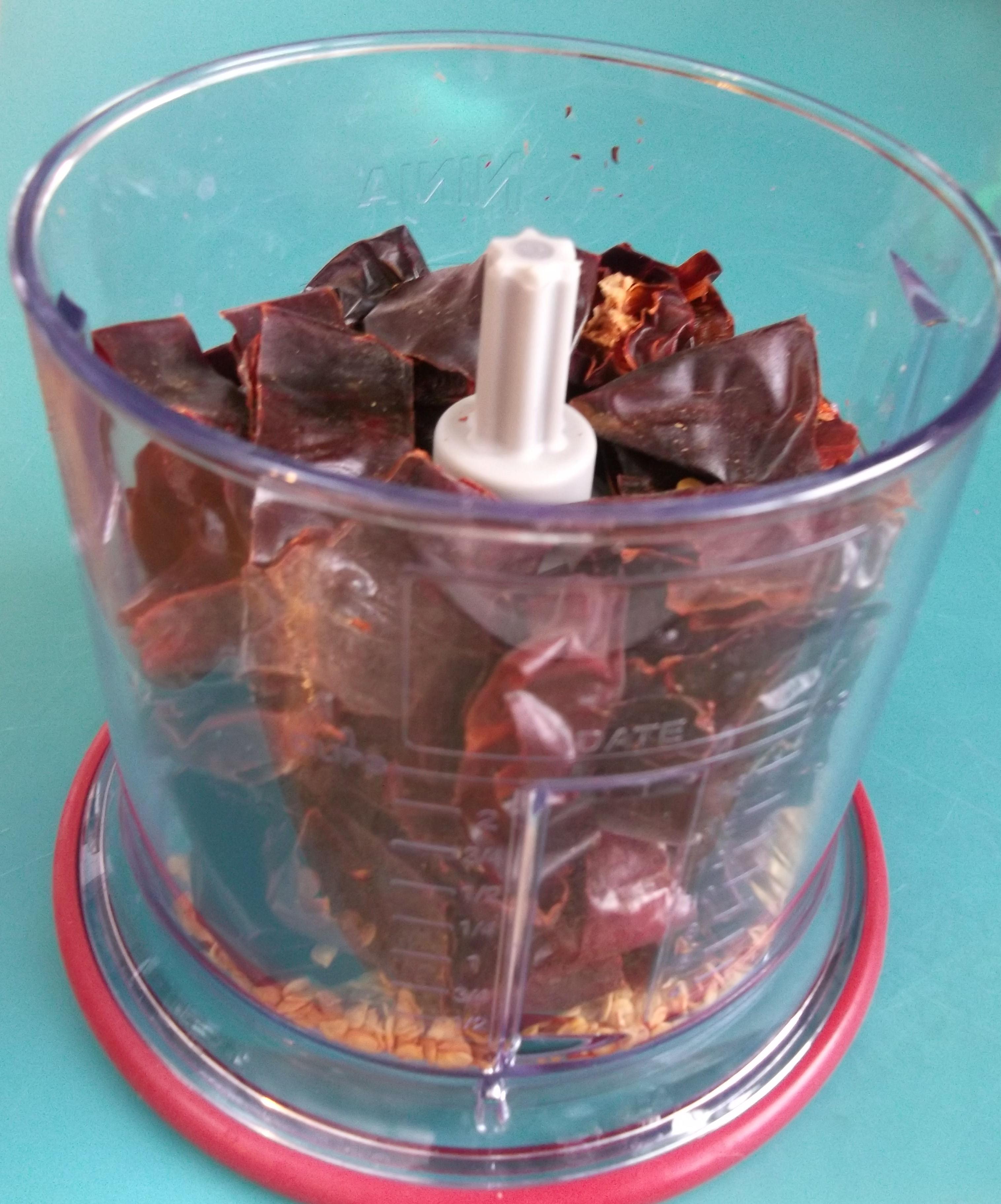 Wearing gloves, trim stems from the dried chiles and chop coarsely: just enough so they fit more easily in the food processor.