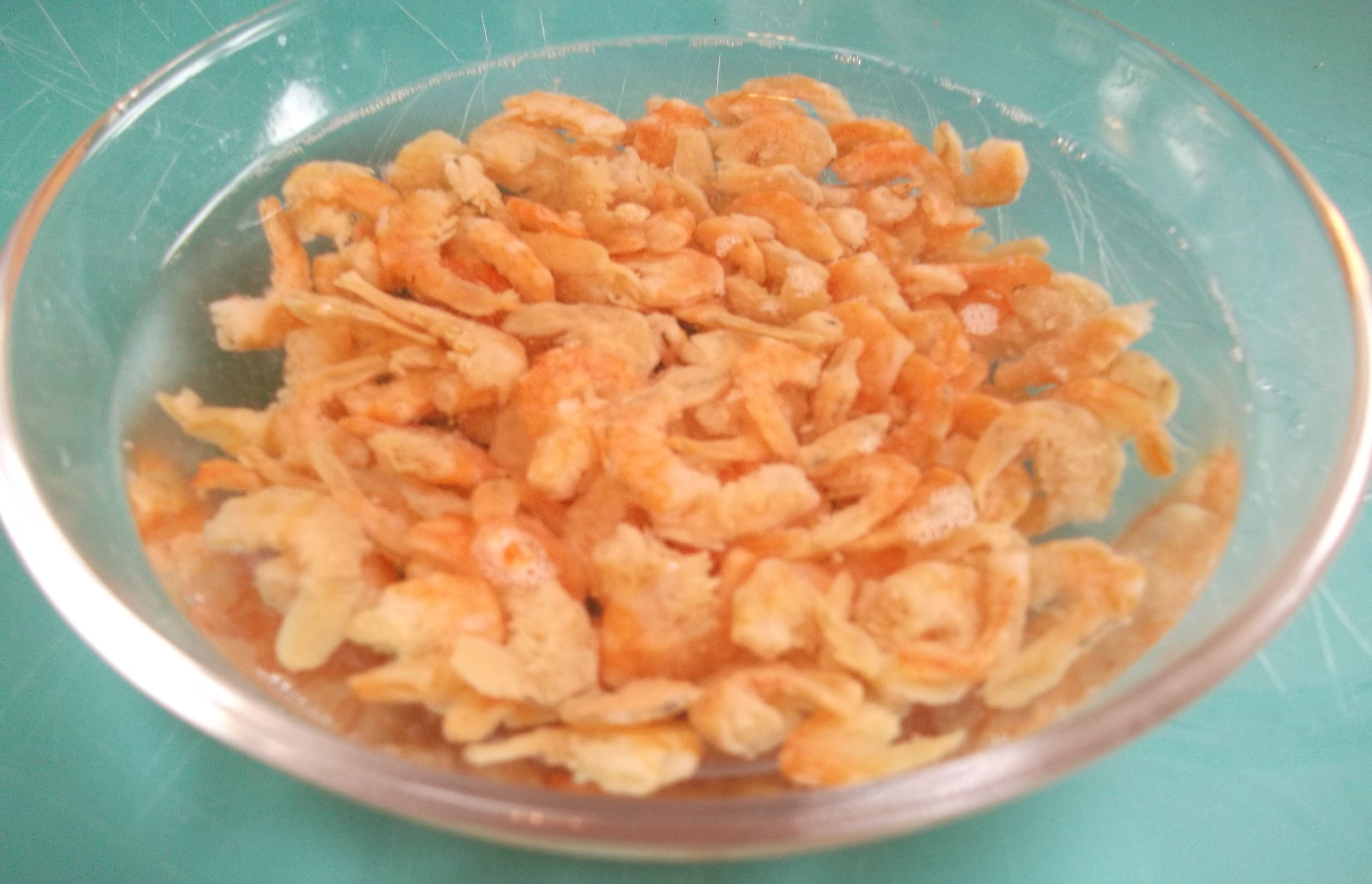 You will most likely need a trip to an Asian food market before for this recipe. Most of them should have dried shrimp: just ask someone there if you don’t know where to look for it. I was a little surprised to find it was in the freezer section. While you are there, also look for chicken stock powder (sometimes sold as cubes), which is basically just completely dehydrated chicken stock, used in place of MSG and best in recipes like this one, where you can’t use liquid stock. (I used Oxo, a brand of chicken stock cubes not sold in the US.)