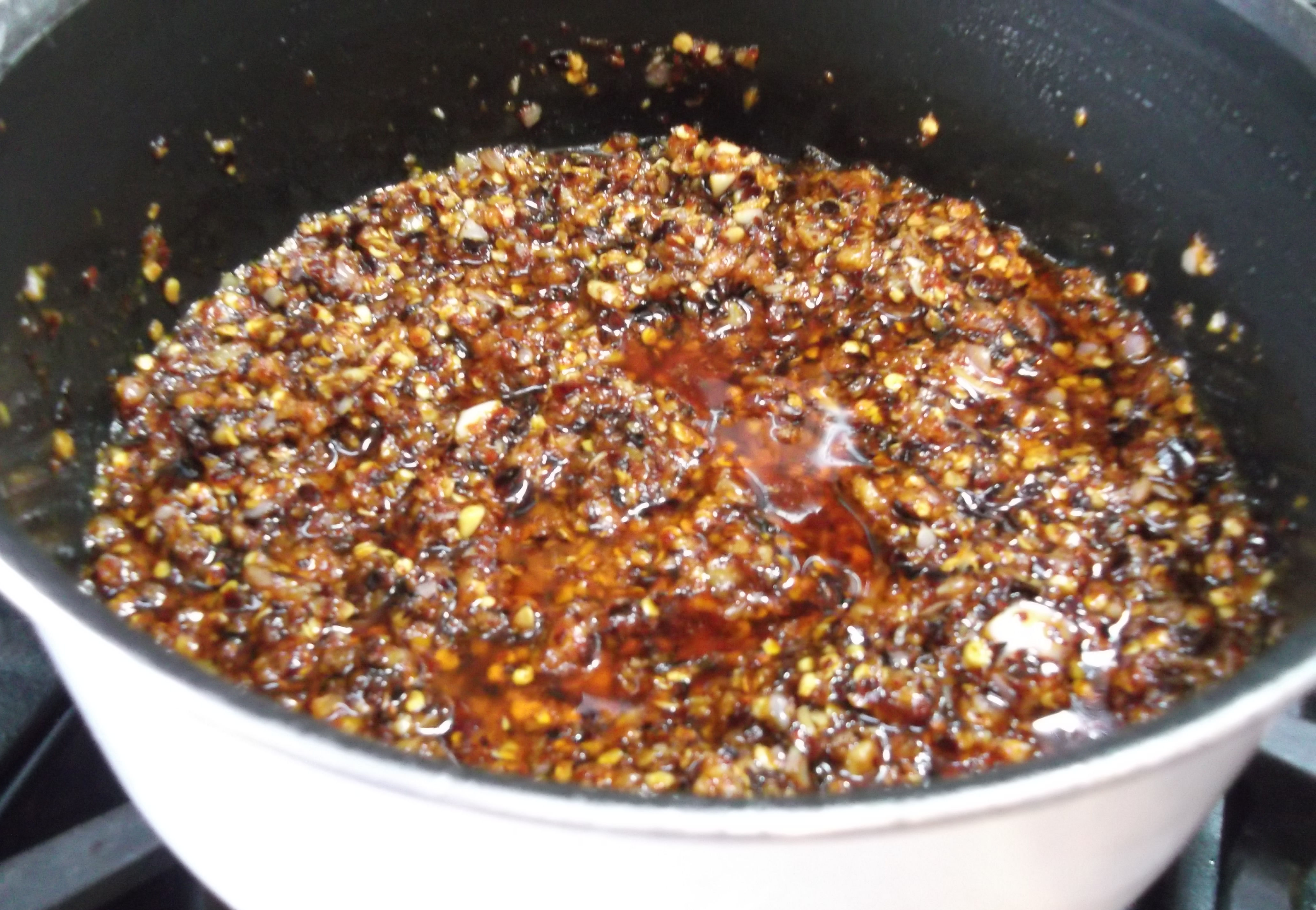 When the mixture is fragrant and has turned darker red/brown, remove the pan from the heat. Stir in remaining oil to reach the desired consistency and flavor. Allow to cool, then spoon into clean bottles or jars. The oil will last several months in the refrigerator.