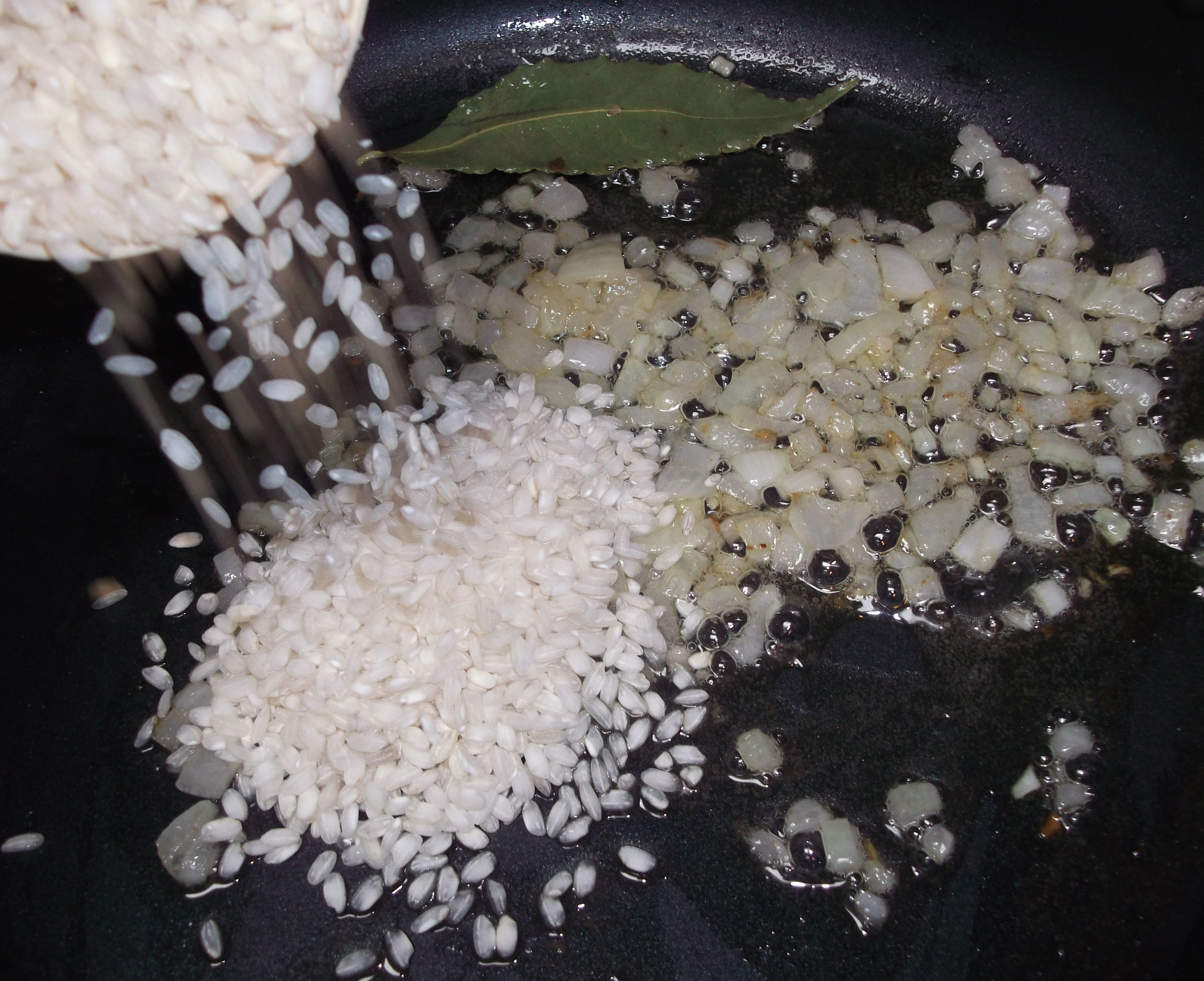 In a large pan, melt the butter over medium-high heat. Add the onion and sauté until soft and translucent, about 3-4 minutes. Lower the heat to medium and add the rice and bay leaf. Cook, stirring, until the rice is lightly toasted, about 3 minutes.