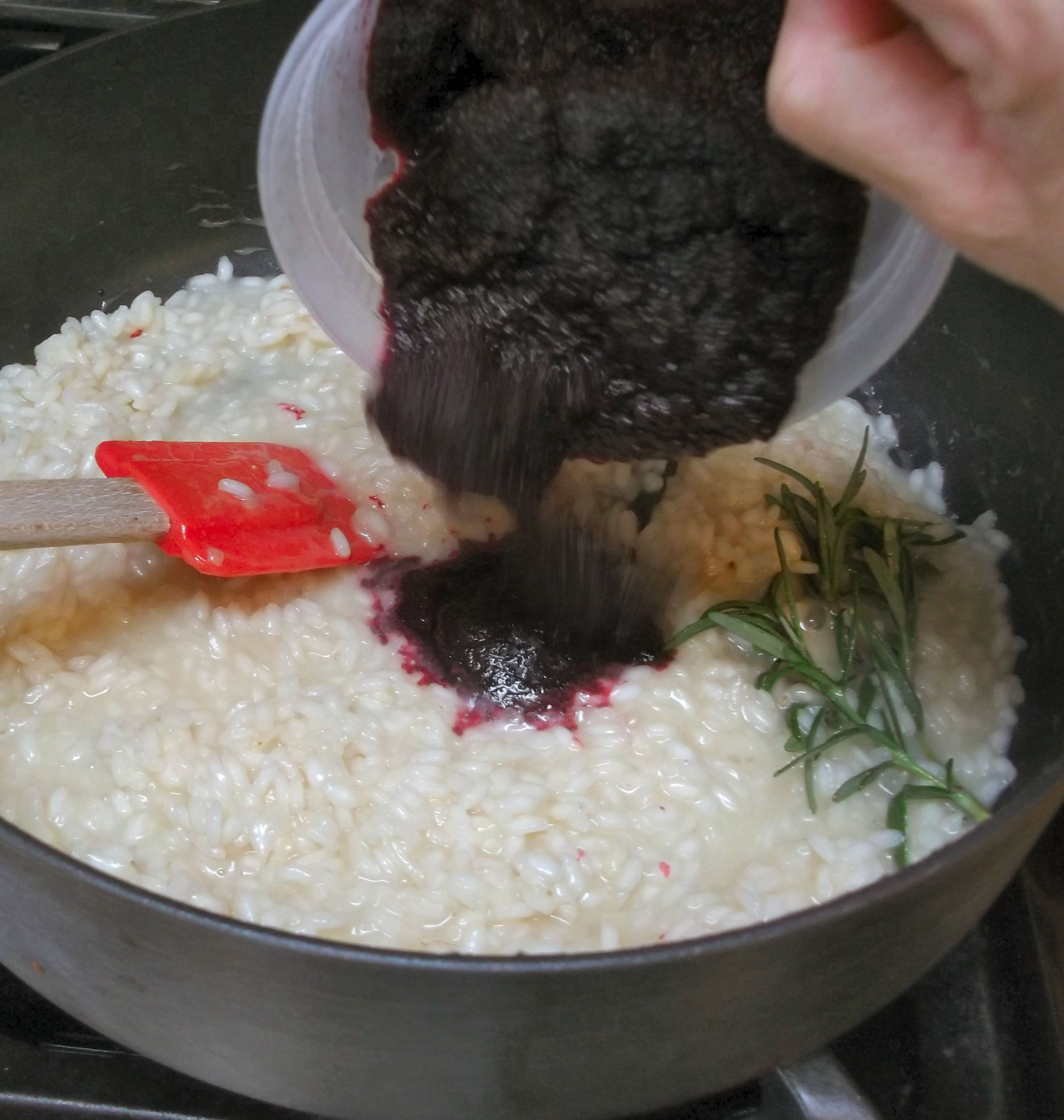 Add more stock, stir until absorbed, and repeat until the last ladle of stock, when you can add the sprig of rosemary, if using, to the pan. If you don’t like rosemary, don’t use it, but it does add a mild woody, pine flavor that goes well with the earthiness of the beets.
