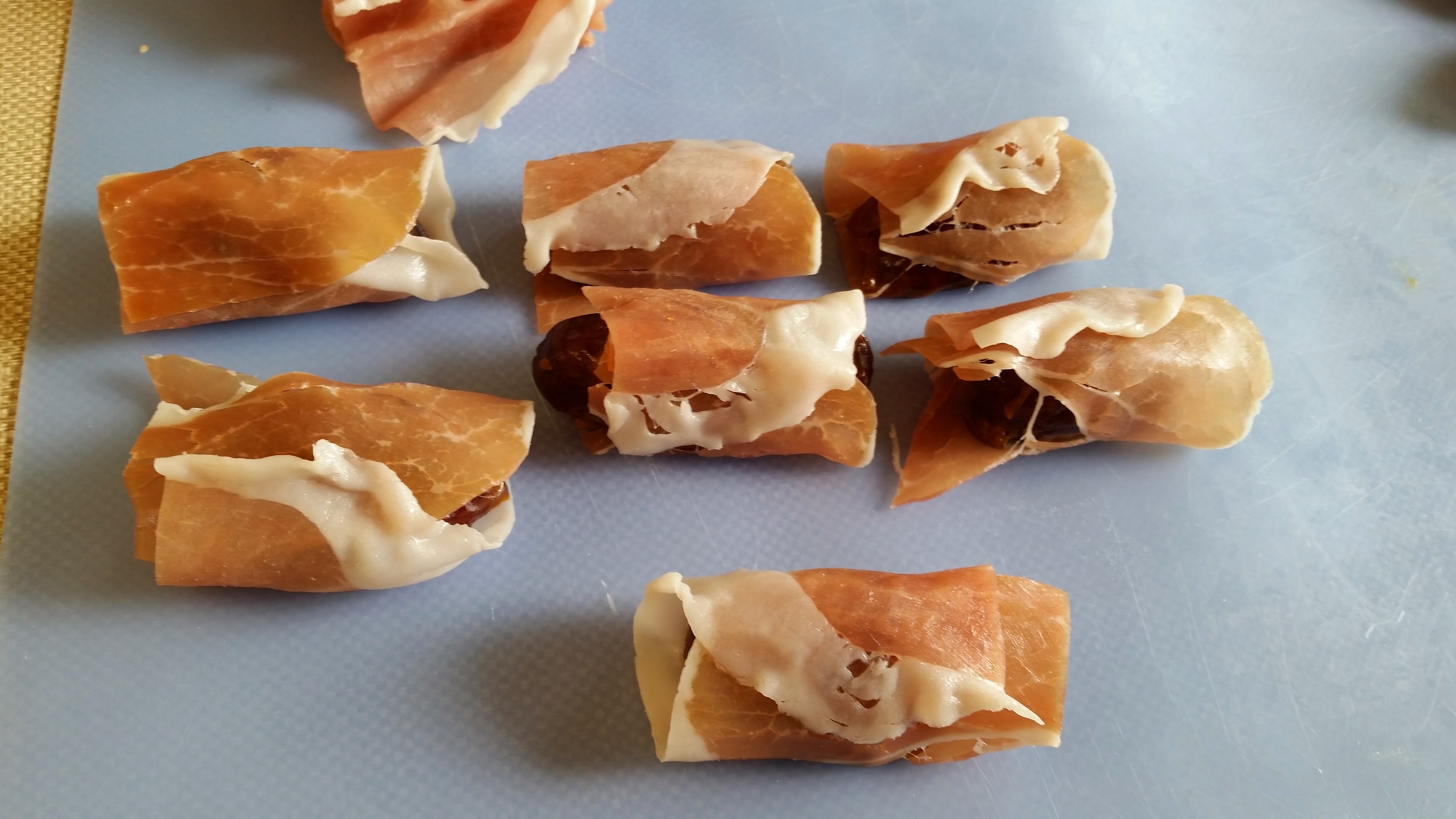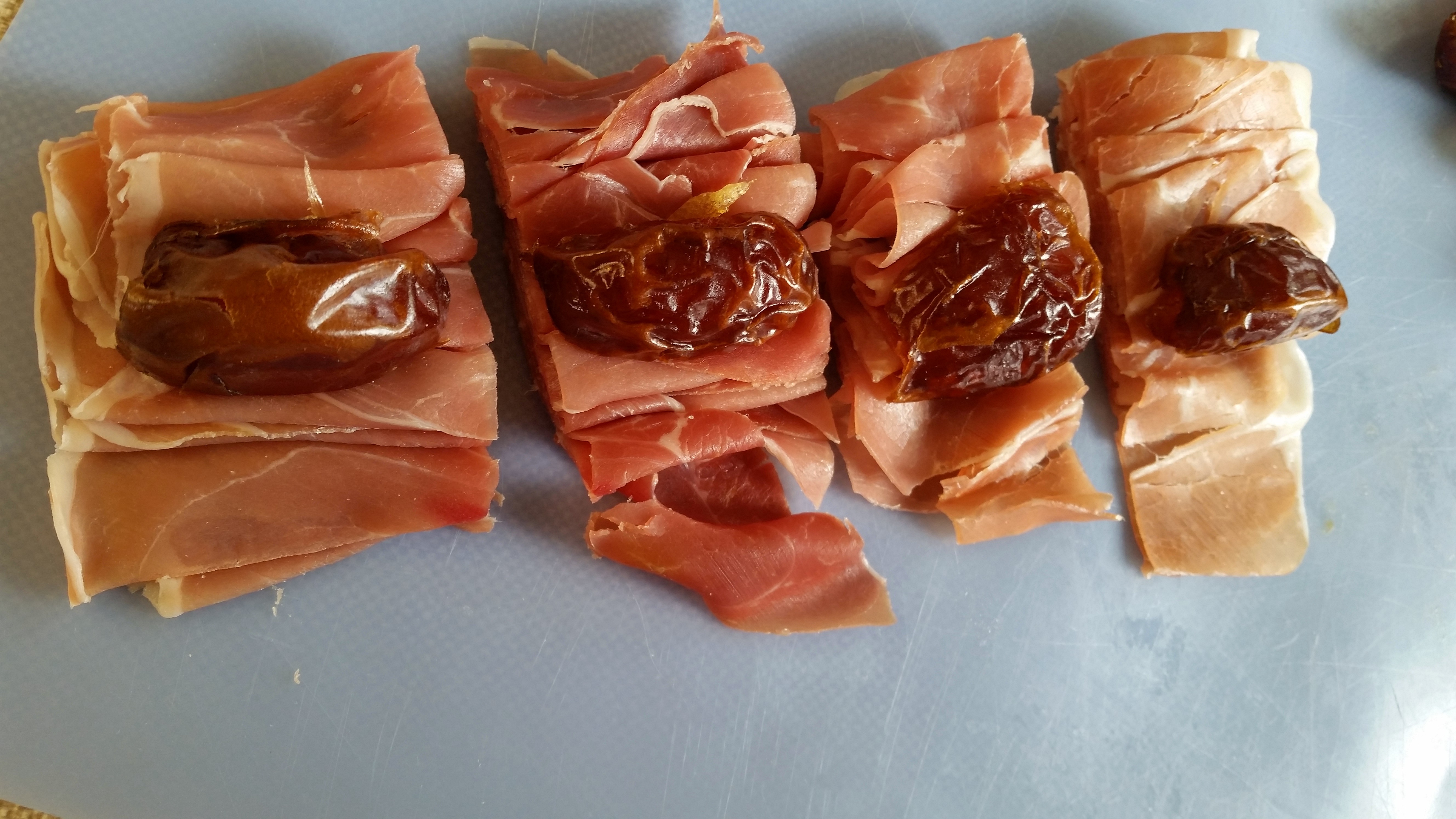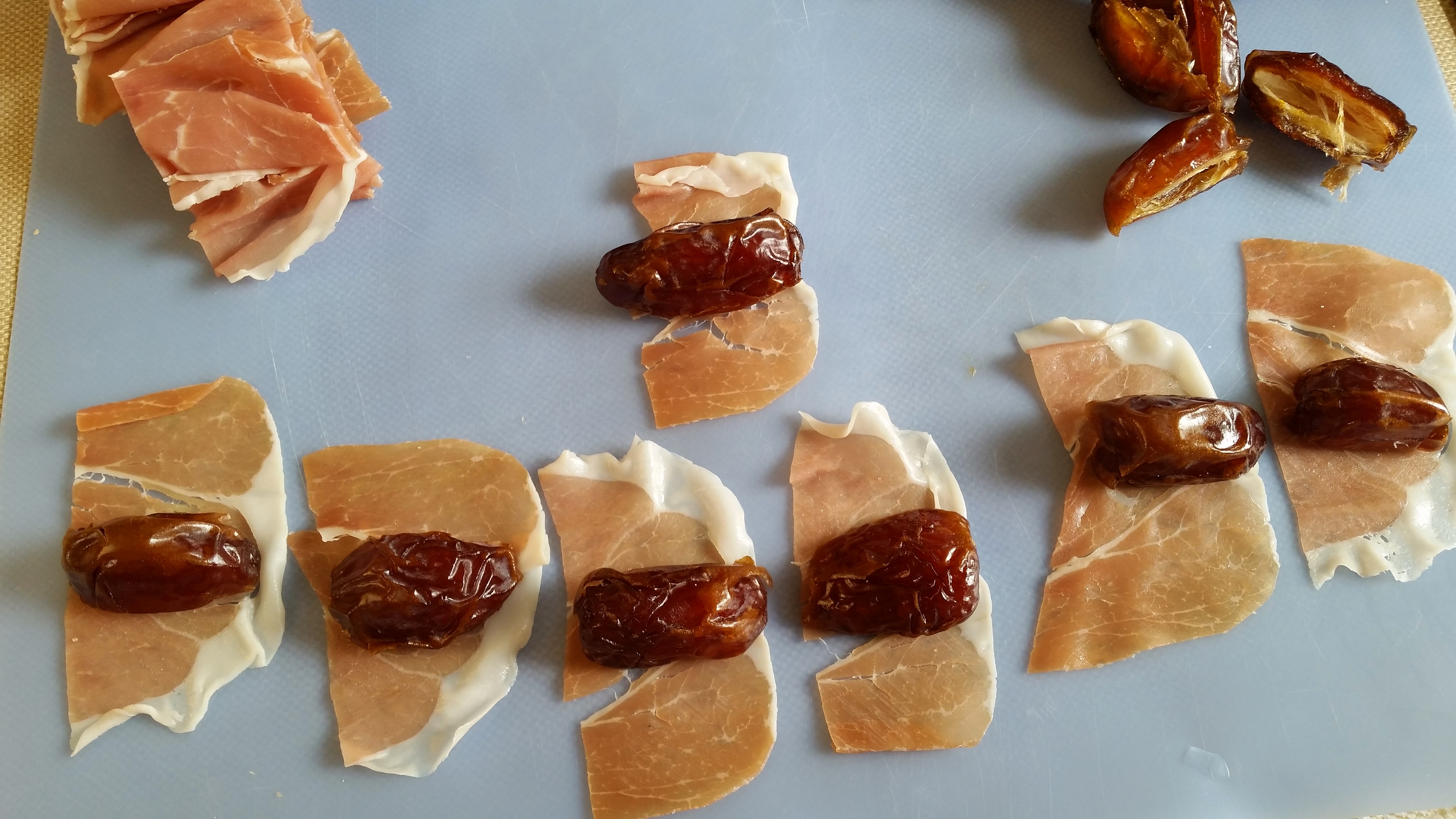 Kind of a sneaky way to measure this is to take the prosciutto out of the package, line up some dates along the length of it, and slice in between the dates. Now you know they’ll fit!