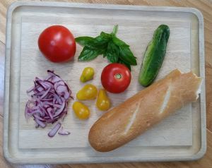 Add the tomatoes, cucumbers, red onion and basil to the bowl of soaked bread pieces and toss to coat. Season with salt and pepper to taste, and serve immediately with a side of sunshine!