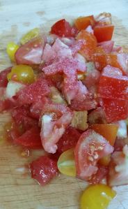 Core the tomatoes and cut them in half, across the equator. Gently squeeze the seeds from each piece into a large bowl (or discard). Dice tomatoes into 1-inch pieces, sprinkle them with the salt and transfer them to a colander placed over the large bowl with the seeds. Gently stir to mix.
